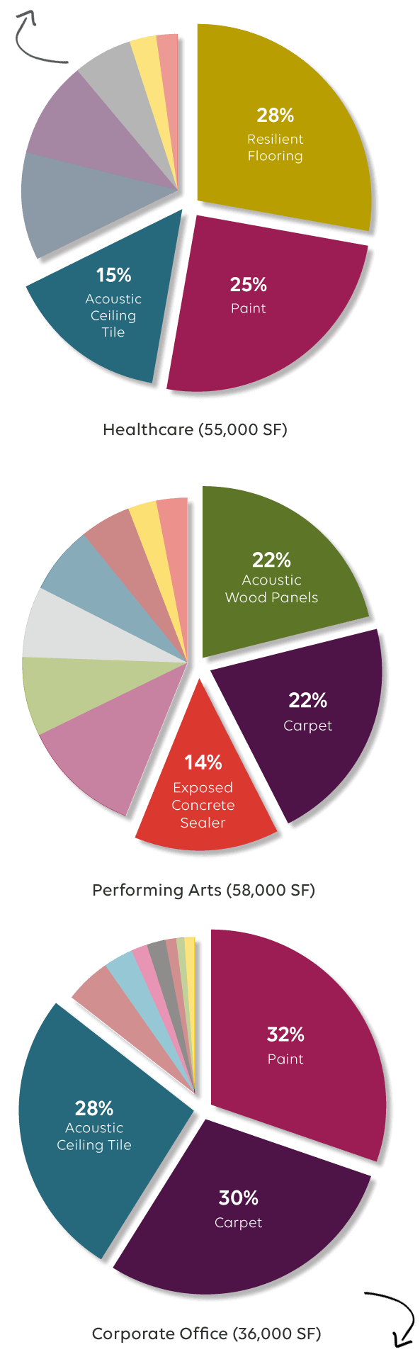 Embodied carbon “heavy hitters” vary by project type. With data gleaned from our ongoing research, designers know that the first areas of carbon focus in material selection is based on the project’s program requirements.