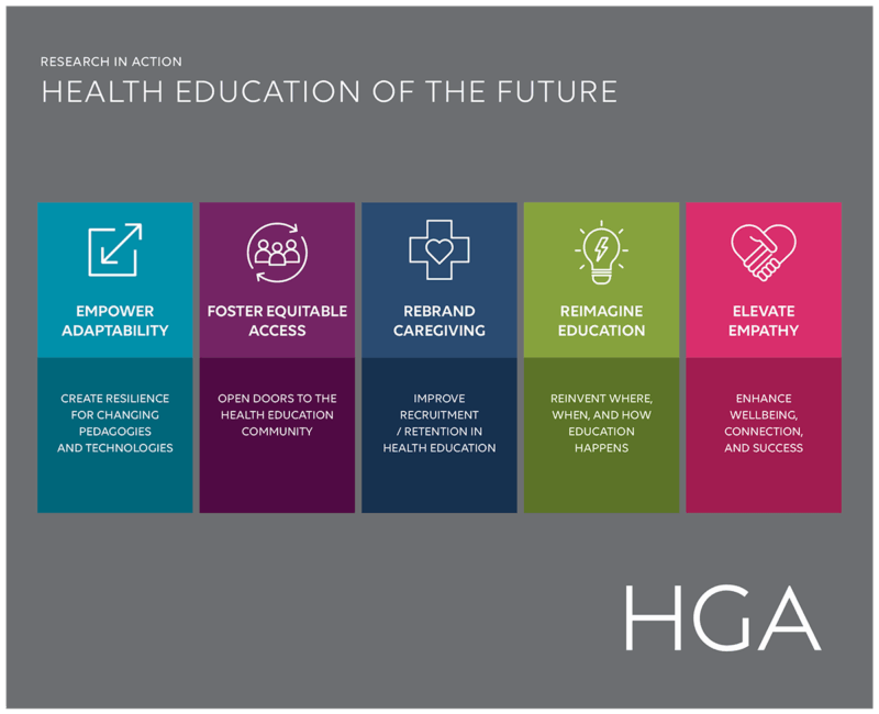 HGA’s healthcare and education specialists partnered with our Design Insight Group—a team dedicated to research and strategic insights—to explore the most pressing challenges health education institutions face as they look toward the future. Through this research investigation, five themes were identified as central to designing programs that successfully catalyze change and advance innovation.