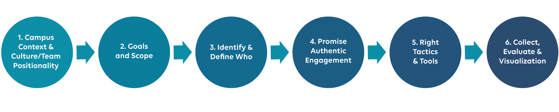Building off the International Association of Public Participation (IAP2) and NAACP Guidelines for Equitable Community Involvement in Building & Development Projects and Policies, this six-step process ensures both higher education leadership and design teams take due diligence for an authentic and transparent process.