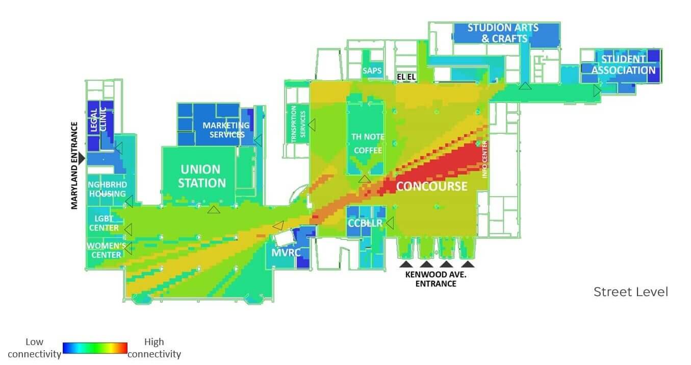 Space syntax analysis involved quantitatively analyzing the spatial configuration of the built environment of the Union by converting architectural layouts into network graphs, where spaces are nodes and connections are edges (see graph below). By measuring metrics like connectivity, the analysis provided insights into how spatial layouts could influence movement and accessibility, yielding valuable quantitative data on spatial relationships and their impact on student interactions within a given environment.