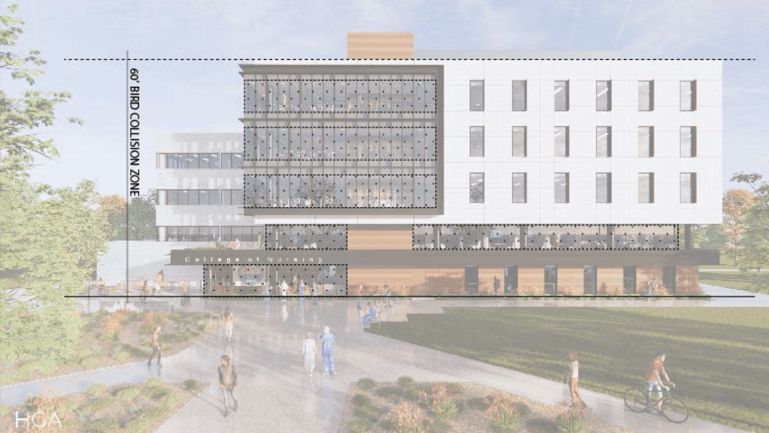 Several recent HGA projects have successfully implemented bird-safe glazing. For the Marquette College of Nursing in Milwaukee, we utilized UV-reflective dots on the outer surface to make glazing more visible to birds without obstructing views from the interior. At a medical center in Pittsburgh, Pennsylvania, vertical lines were silkscreened at 4-inch intervals on the outer surface of the glazing to heighten visibility. Both projects referenced best practices like Audubon’s bird-safe fact-sheet and various state-led policies.