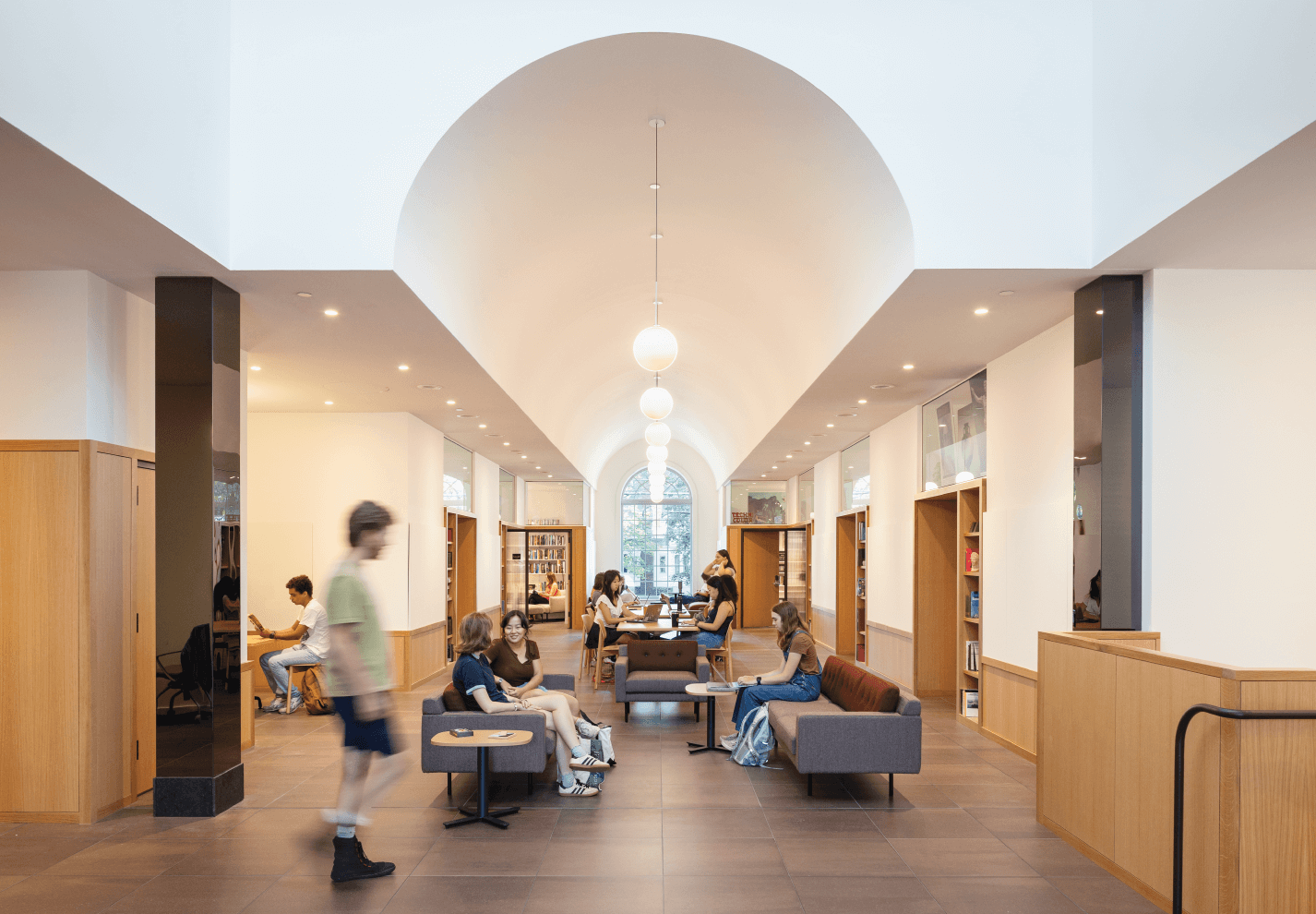 The renovation of Sills Hall at Bowdoin College celebrates the “intellectual gravitas” of the humanities—home to the Romance Languages and Literatures, Russian, German, and Classics departments. The design reflects the historic character of the existing building while reinventing the interior with modern, light-filled features, such as a study lounge adjacent to faculty offices to foster student-faculty conversations.