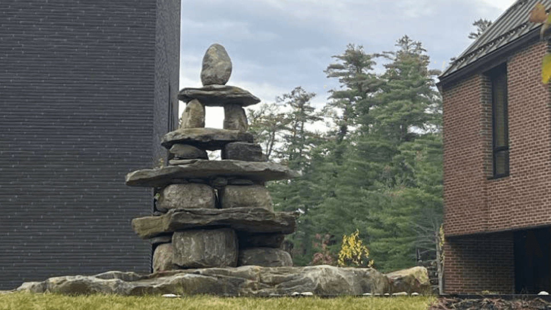 The client-commissioned Inukshuk, created by Inuit artist Piita Irniq, reinforces cultural presence within the landscape. Nearby, a stone marker acknowledges Bowdoin’s location on the ancestral homelands of the Wabanaki people.