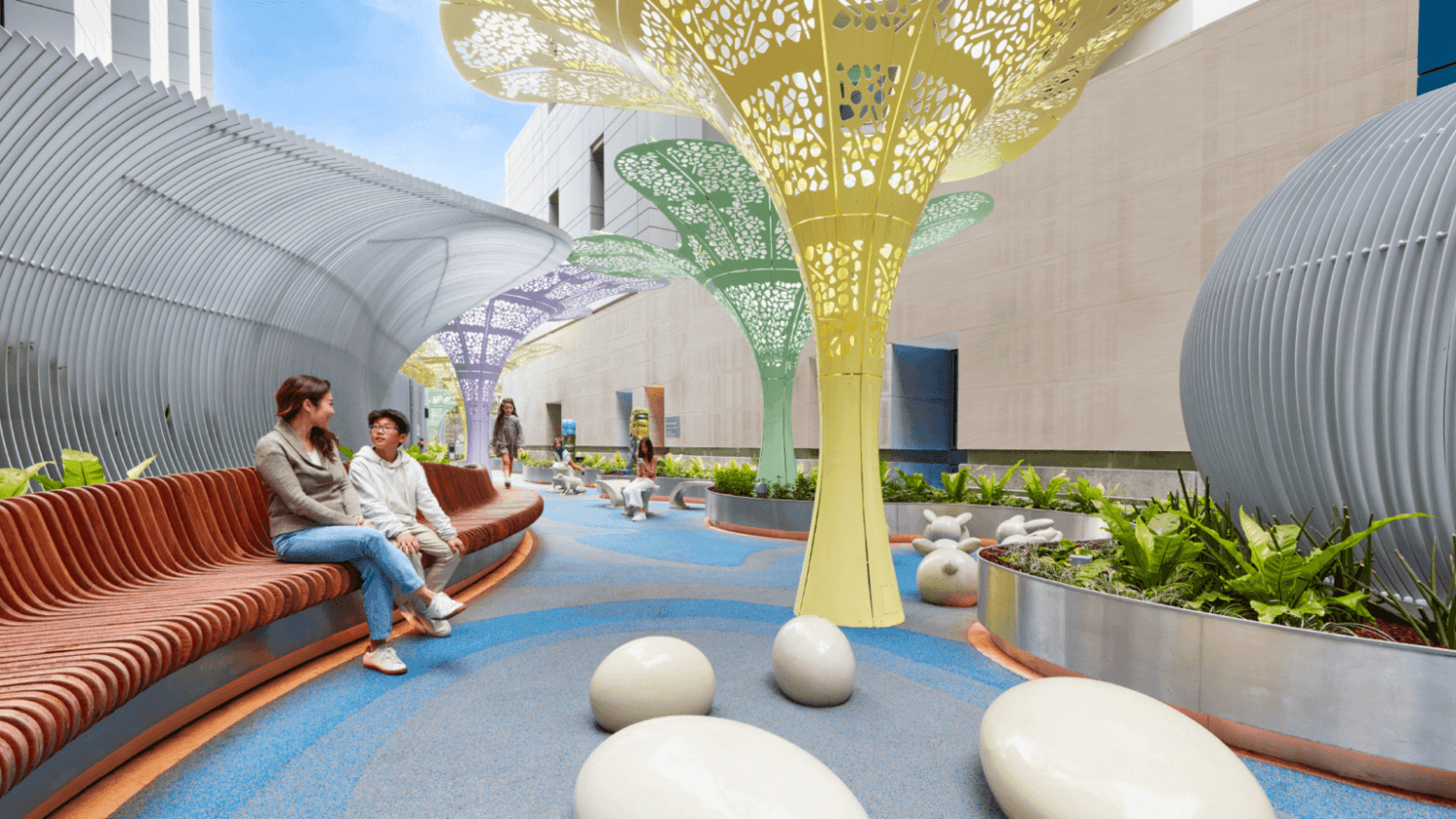 A Healing Garden at Cedars-Sinai Guerin Children’s evokes a fantastical feeling with artist-designed sculptural elements, such as frogs and rabbits, a leaf table, patterned walkway surfaces, and a canopy of large steel flower sculptures in pastel yellow, green, and purple.