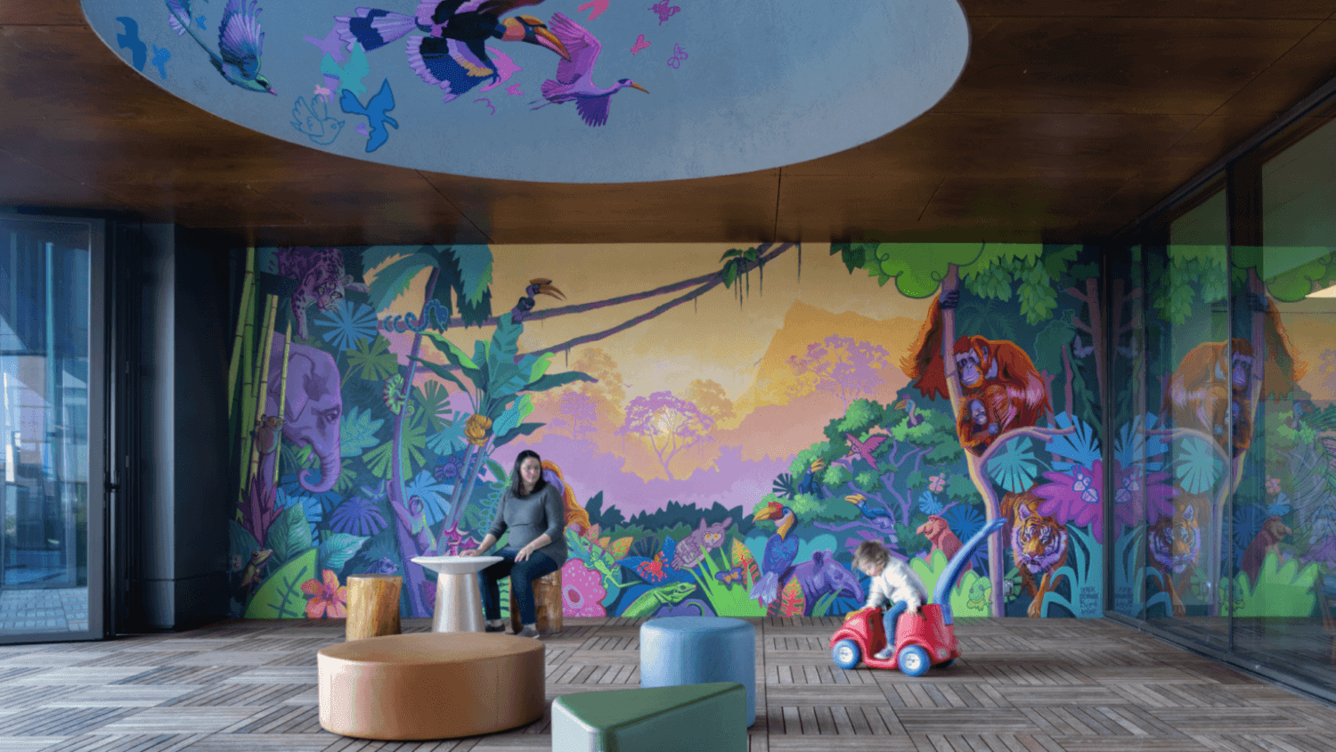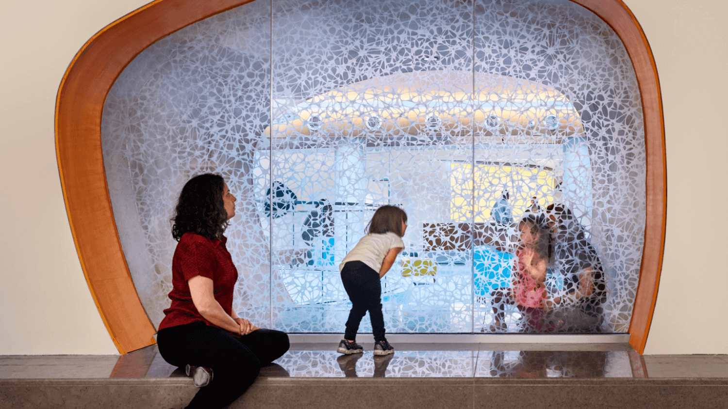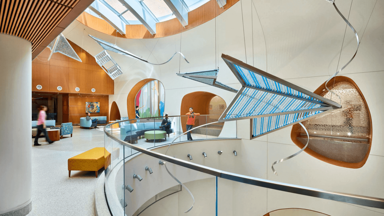 Make the experience an adventure. Imagine the space through the children’s eyes. Remember, kids are not all the same size and age. They have different perspectives and needsEntering a large atrium can be intimidating for kids of a certain age. It is important to think of varied scales to create a comfortable and welcoming environmentInviting seating cubbies, locally inspired art, graphically compelling wayfinding, and low-tech and high-tech interactive features such as video walls can engage children as they move through waiting and common spaces.
