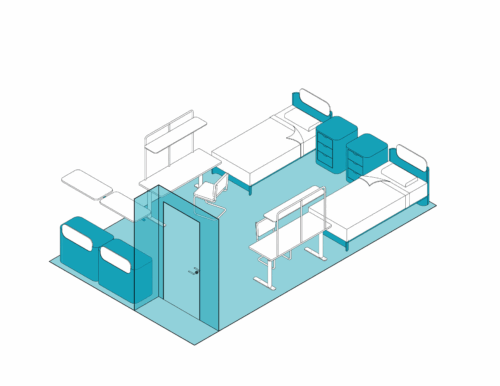 Semi-private transitional spaces, like the one shown above, serve as extensions to private spaces in residence halls. In the diagram, flexible furniture allows residents to create different layers of privacy within a typical double room.