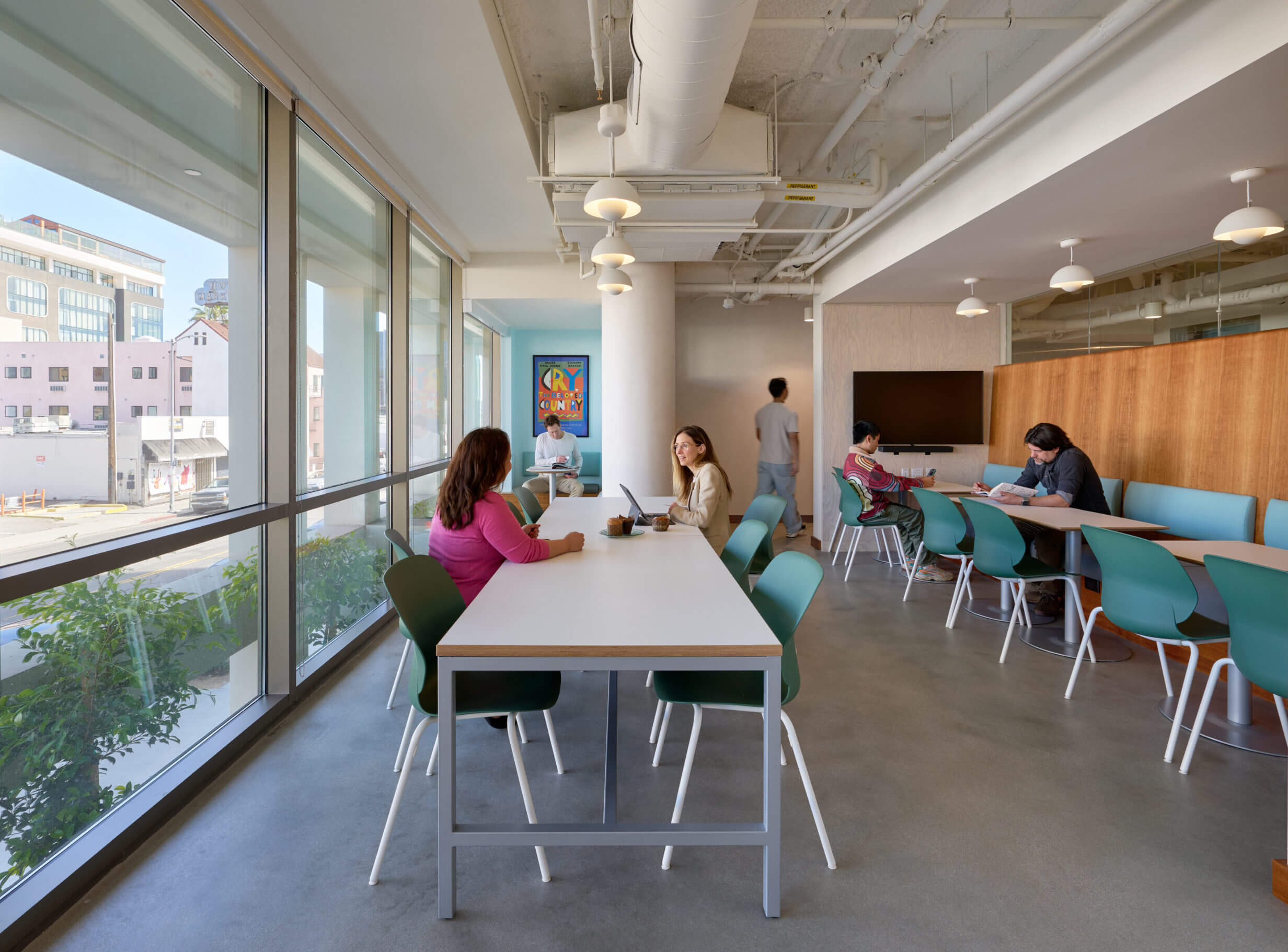 The new Western region headquarters for the Entertainment Community Fund (ECF) is a multi-level 12,000 square-foot office space, designed by HGA, to serve as a home base for the West Coast operations of the national human services organization. Fostering stability and resiliency in its mission to provide support for performing arts and entertainment professionals, the new, purpose-built regional headquarters will allow the ECF to more comprehensively deliver the critical services and resources that help creative professionals stay and thrive in the local area. The new offices form the cornerstone of the two-building Hollywood Arts Collective, a development focused on expanding access to affordable spaces for artists to live, work, and created in the heart of Hollywood. The design preserves the area’s cultural and artistic legacy while emphasizing transparency, engagement and collaboration, with a mixture of flexible workspaces alongside private offices and meeting rooms. Learn more about the Hollywood Arts Collective project, including the in-progress Rita Moreno Arts Building project, here.