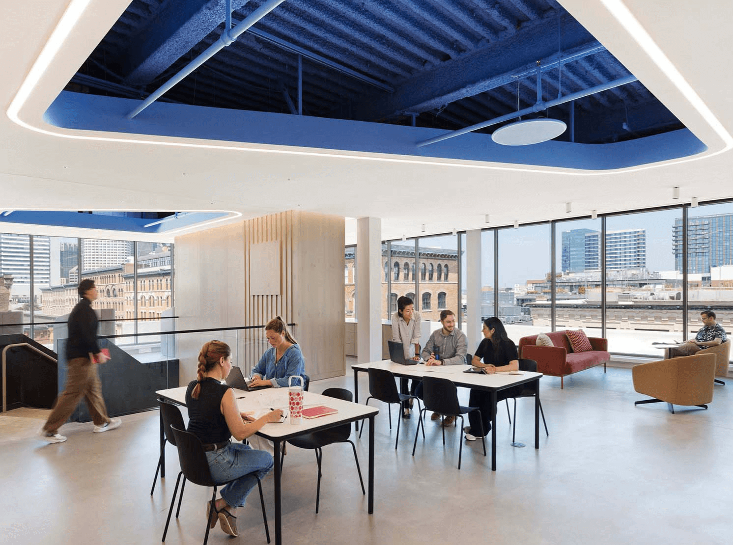 HGA’s Boston office has relocated to Fort Point, a vibrant artistic community near major universities, research groups, and healthcare institutions. The new location enhances connectivity for employees and clients with immediate access to cultural, culinary, and transit options. Spanning the top two floors, the office blends historic features such as arched windows, exposed brick, and timber beams with modern workspaces including phone rooms, focus rooms, huddle areas, reservable workstations, and a glass “jewel box” atop the building offering panoramic views. A new staircase connects both levels and anchors a gallery for presentations and events. Designed for WELL Silver certification, the space includes adaptable furniture, natural light, sound control, quiet zones, bike storage, a lactation room, and a wellness roomRead more about the new office, marking a new chapter for HGA, here.