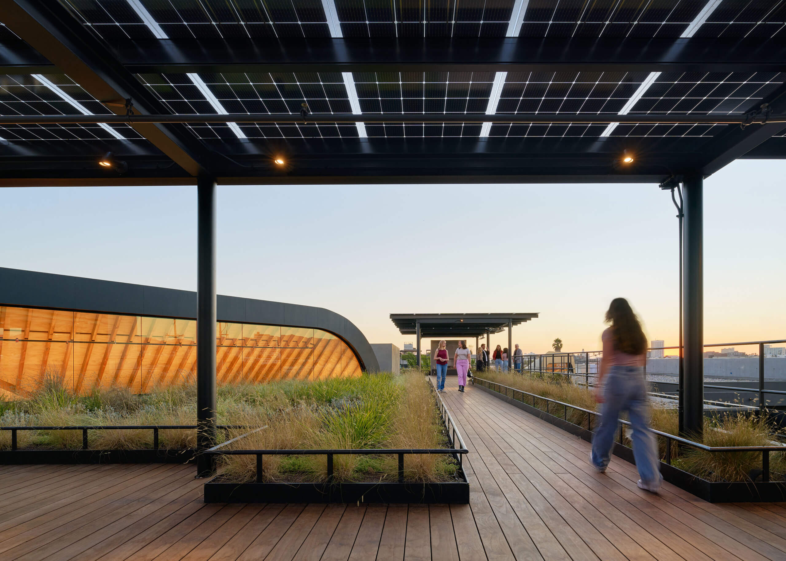 Resiliency and sustainability conceived through the lens of human well-being comprehensively inform the building’s design and operation and are highlighted through natural ventilation, daylighting, and the integration of landscape. A cornerstone element of the building’s sustainable design is the trellis-mounted solar photovoltaic system on the rooftop deck that exceeds Santa Monica’s current ZNE Reach Code requirements by more than double to reduce its resource footprint burden on municipal infrastructure.