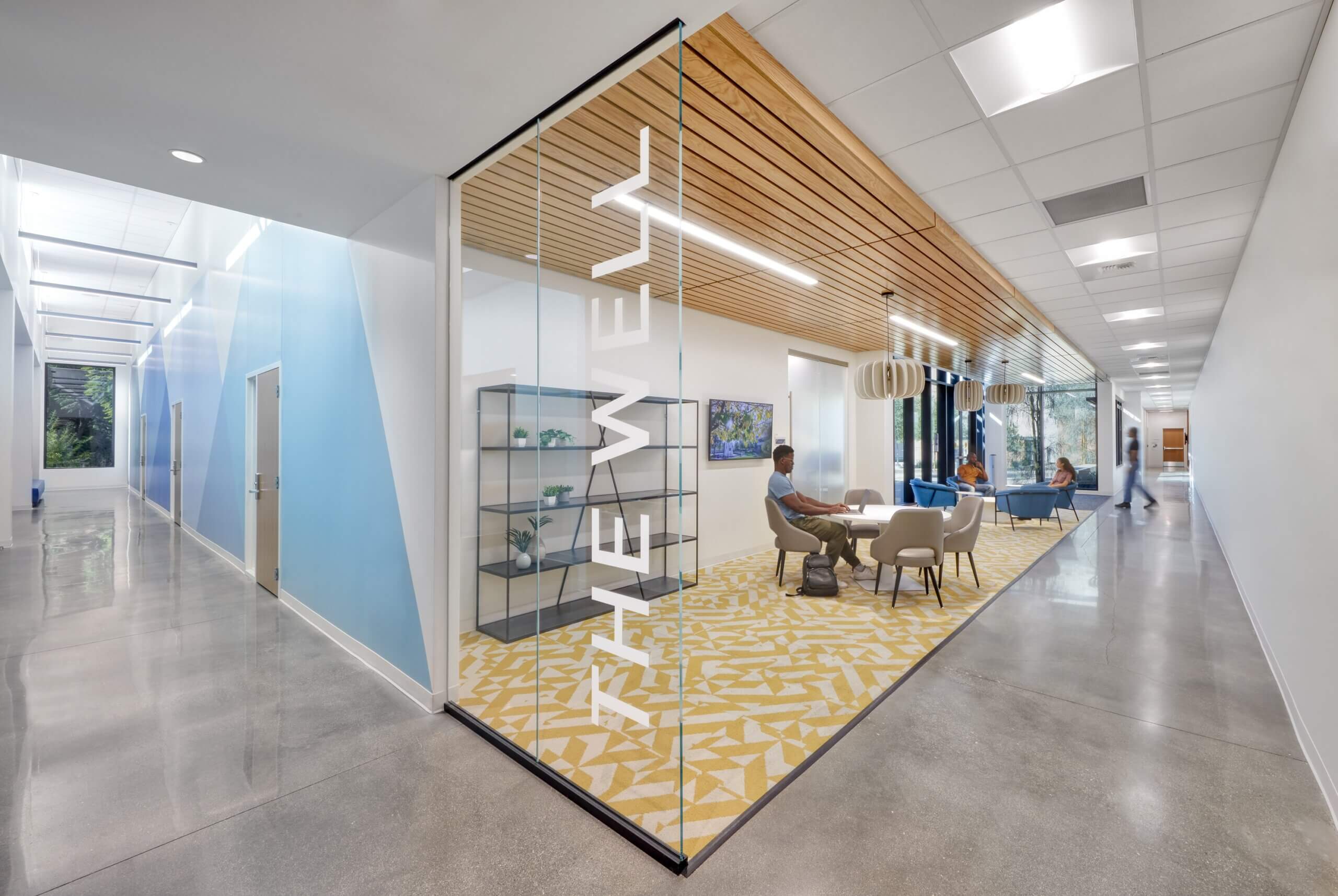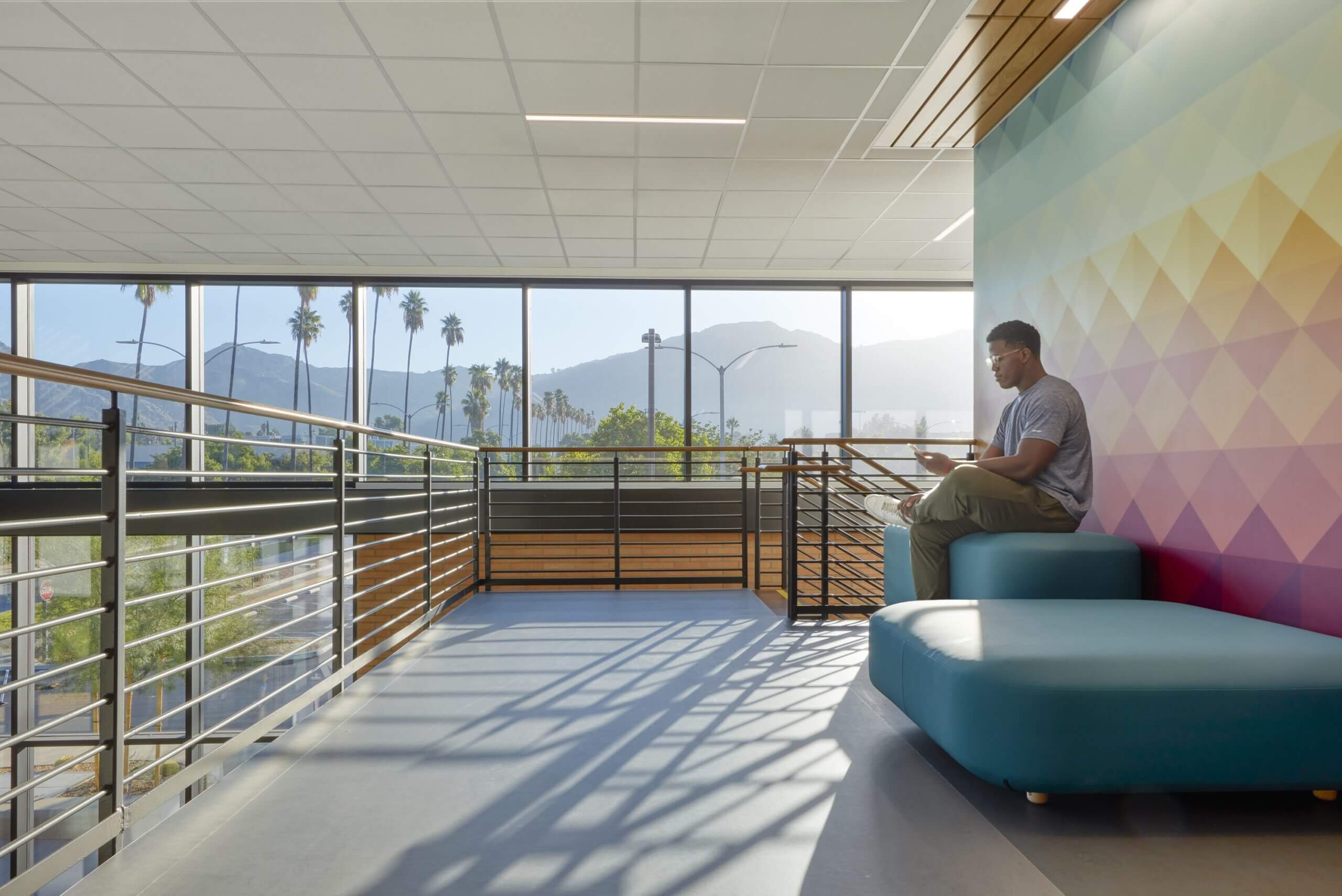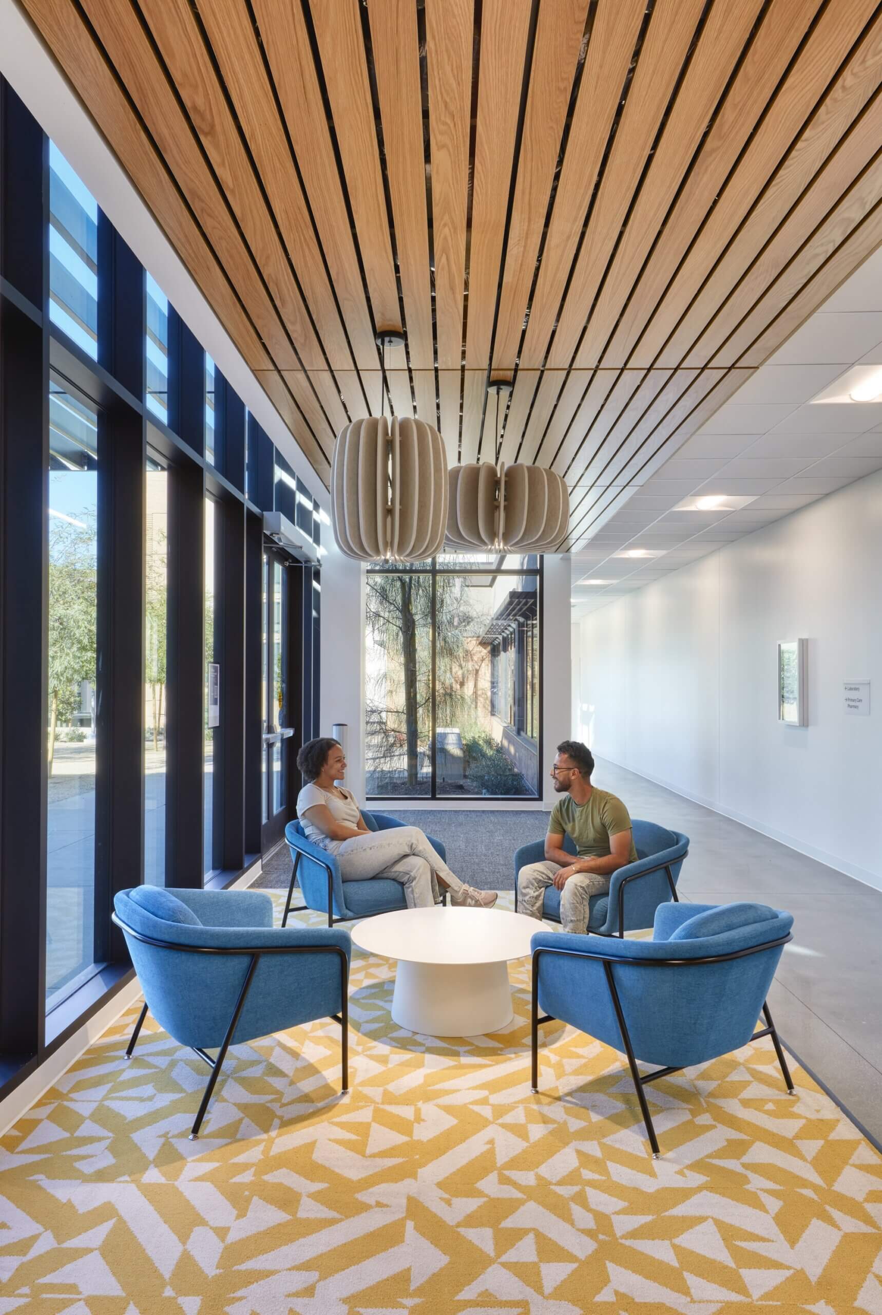 The design also focused on the student experience, providing a modern healing atmosphere for those who are ill and a welcoming space to promote ongoing services and preventative care for students campus wide. Soothing, biophilic design elements contribute to the overall environment with large windows that allow natural light and take advantage of views of the Box Springs Mountains to the east and the Wellness Court and green belt to the south. A custom wood art wall design accents the main lobby reception area and the counseling center features specialty wood ceilings. A spectrum of soft blue, yellow and green pastel colors decorate walls in the first and second floor lobbies, a nod to the calming effects of nature.