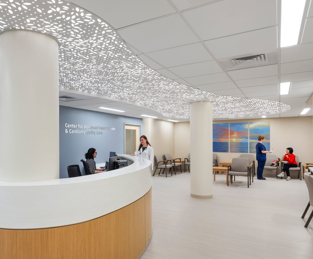 The Center for Advanced Heart Failure and Cardiomyopathy Care at Beth Israel Deaconess Medical Center is now open. Designed by HGA, the new outpatient clinic offers a reimagined patient and provider experience in a cutting-edge facility for the leading cardiovascular services provider in Massachusetts. HGA’s design team, along with the Design Insight Group and hospital stakeholders, developed a comprehensive patient care model to accommodate treatment and testing needs for over 5,000 patients per year. The clinic includes exam rooms and specialized spaces for echocardiograms, stress tests, ultrasound, and infusion treatment. The design features warm and welcoming shades of blue, purple, and beige. A contemporary ceiling feature in the waiting area, with organically shaped and naturally patterned lighting, creates a soothing and calm environment for patients and their families. Read the full story here