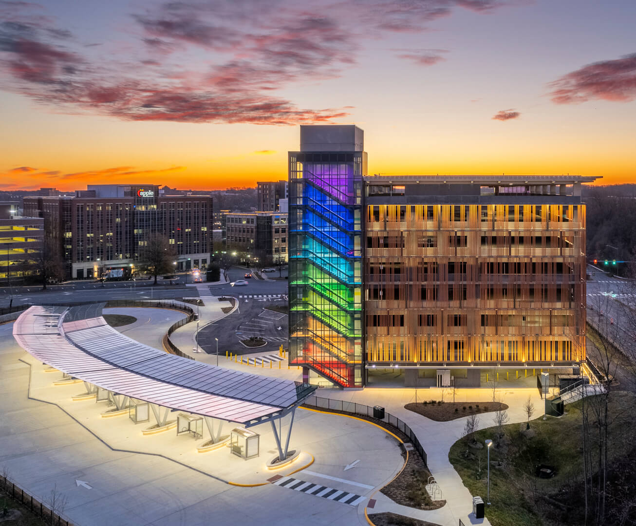 The new Monument Drive Commuter Parking Garage and Transit Center in Fairfax County, Virginia, is now open. Designed by HGA, the transit center aims to enhance commuter comfort, reduce traffic congestion, and promote sustainable mobility. The state-of-the-art facility features eight levels of parking, a bus transit center, indoor and outdoor bicycle storage, and introduces “slugging” for ride sharing. Visible from the nearby interstate, the facility includes a glass canopy, steel triangular composition, and a glass stair elevator tower, seamlessly blending into the environment with an emphasis on user safety and landscape integration. This includes prioritized tree preservation and new plantings, creating a park-like ambiance. The facility will support county events, has a shared-use path, and includes numerous sustainability elements like Parksmart Silver Certification, 75% NetZero energy consumption, solar arrays, a green roof, and 40 EV chargers. Ensuring an integrated, high-quality, and visually appealing experience, the facility features captivating lighting transforming its appearance after dark, setting it apart from typical parking structures. Learn more here