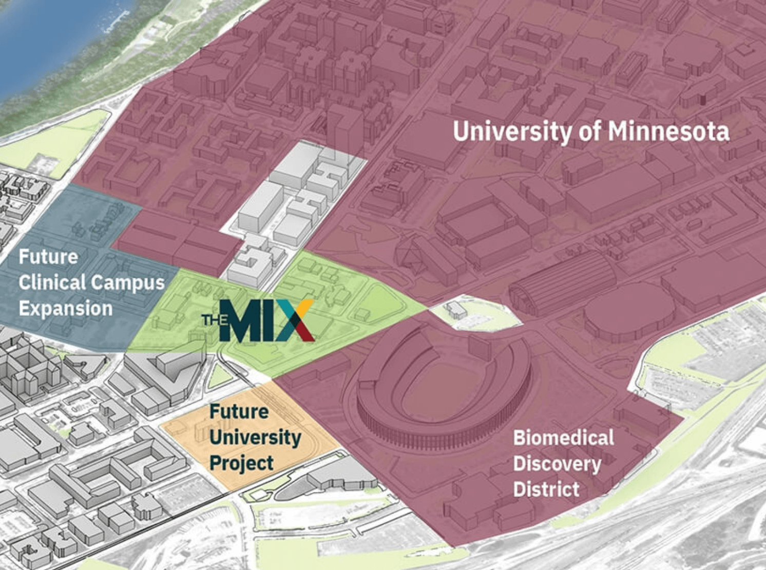 The first building on the site of the Minnesota Innovation Exchange (The MIX) is undergoing city review and will set the tone for the 12-acre redevelopment on the edge of the University of Minnesota’s Minneapolis campus. HGA is working with Mortenson Co. and the University of Minnesota Foundation Real Estate Advisors in a vision to create spaces for those that want to be close to the innovation and research of the university, through a dynamic living and learning community. Bounded to the north by Biomedical Discovery District and Huntington Bank Stadium and to the south by the university’s future clinical campus expansion, The MIX is well positioned to anchor Minnesota’s next innovation hub. The first phase will be a 10-story building housing advanced lab space and offices, with retail space and restaurants on the ground floor. Working with TEN x TEN Landscape Architects, the first phase also includes the beginning of a multiblock green space that will eventually connect directly to the campus. Part of a three-phase project, future phases will include housing, hospitality and additional spaces for innovation, entertainment, and retail. Learn more about the vision for The MIX here.