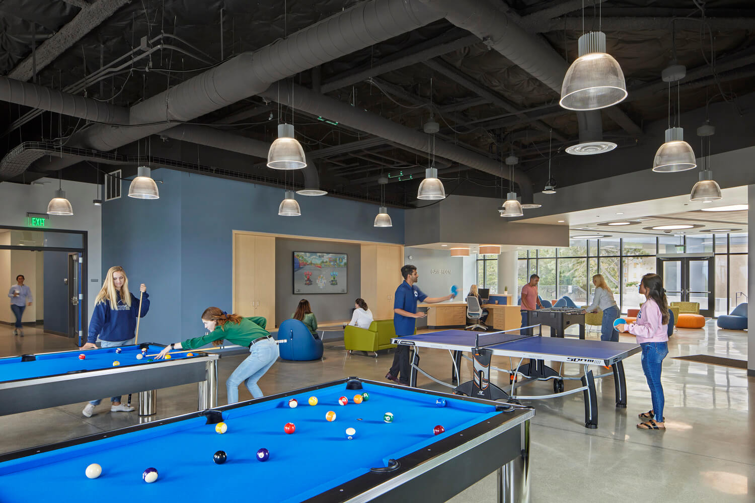 The goal was to design an inclusive environment for a diverse student population and provide amenities that create a ‘living room atmosphere,’ where students can socialize, collaborate, and study under one roof—within an equitable and versatile backdrop for student life. The building siting captures sustainability best practices, maximizing natural daylighting and shading with a design that yields a symbiosis of indoor and outdoor gathering space and provides a welcoming transition from the Main Quad. Natural cross-ventilation opportunities were created by reducing the building depth and forming a “U” shape building footprint.