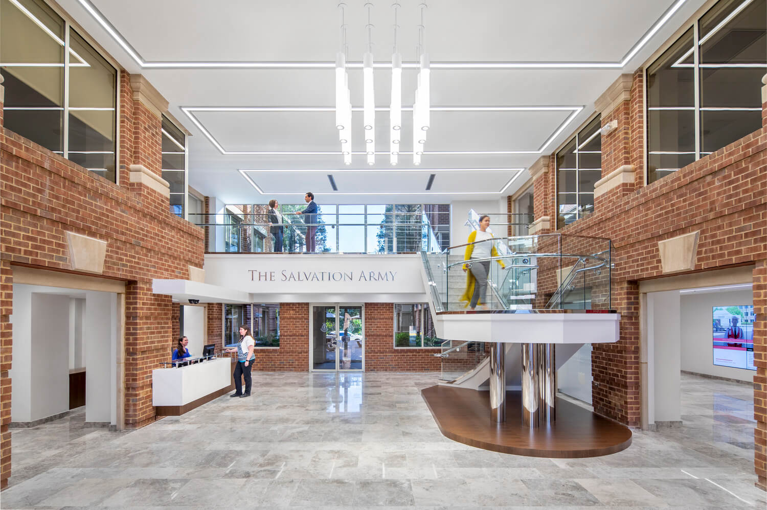 We are pleased to announce the completion of the renovation of The Salvation Army’s (TSA) National Headquarters in Old Town Alexandria, Virginia. The 40,000-square-foot headquarters, originally designed by HGA in the 1980s, was in need of an interior refresh and modern advancements to more effectively support the organization’s mission and efforts.