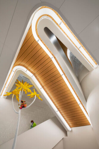 The new arrival sequence features a design that is calming and sensory stimulating – together they engage the visitor and help place them at ease. Engaging tactile surfaces now provide positive distractions. They include pops of color along accent walls and a 15-foot-tall structure, provided by RxArt Foundation titled, “Tree to Be Me,” that stands at the base of the stairway. The mixed media work of marble, steel, and fabric, created by The Haas Brothers, resembles a “magical beaded palm-tree” and features a “resident monkey” who greets visitors as they ascend the winding staircase.