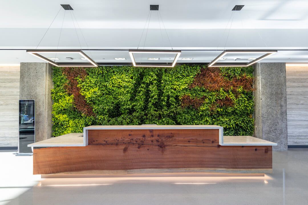 To bring in more natural light and boost street-level appeal, HGA removed outdated ground-floor office suites and replaced the building’s dark, film-covered windows with clear, energy-efficient glass. The lobby was elevated literally and visually by stripping away archaic overhead systems to reveal the original concrete waffle slab, which was refreshed and painted to complement the existing exposed columns. The building’s central core was wrapped in elegant travertine, while locally sourced redwood was used to craft the reception desk, slatted elevator lobby ceiling and new plaza benches. Anchoring the lobby with lush greenery, a vibrant living wall behind the front desk creates a striking focal centerpiece and biophilic bridge, strengthening the connection between the built environment and the natural world.