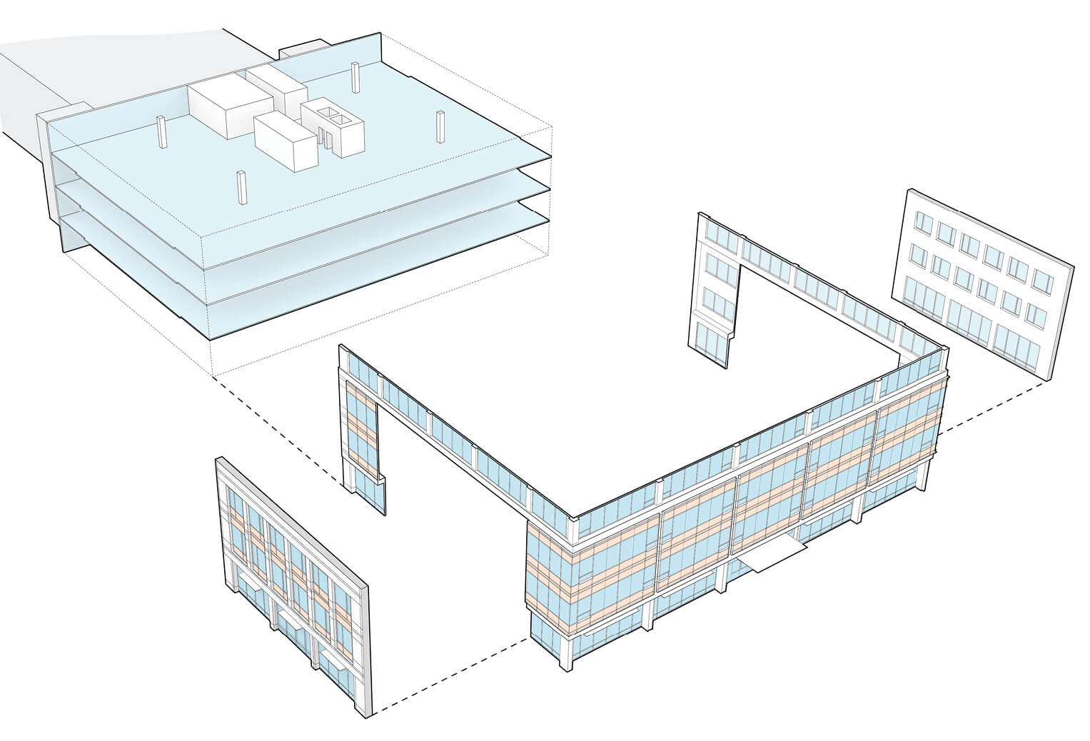 “We are building in obsolescence if we are building less than LEED Gold.” Looking to the tenant(s) of the future, Minkoff did something rather unusual for a speculative developer at the time; he invested up front in an energy efficient, sustainable office building with a target of LEED Gold or better. A green building would attract tenants with an eco-friendly value system and add to employee pride. The design maximizes natural light with an innovative wood louver system on the main north facade that offers floor-to-ceiling views out while filtering the sun’s most intense rays. Operable windows are featured throughout, and the entire project features low voc, locally sourced, and recycled materials wherever possible. While the central expressway-facing north side of the site allowed for a more blank canvas for the building’s own future-focused identity, the west and east edges needed to address the adjacent housing and existing retail buildings.