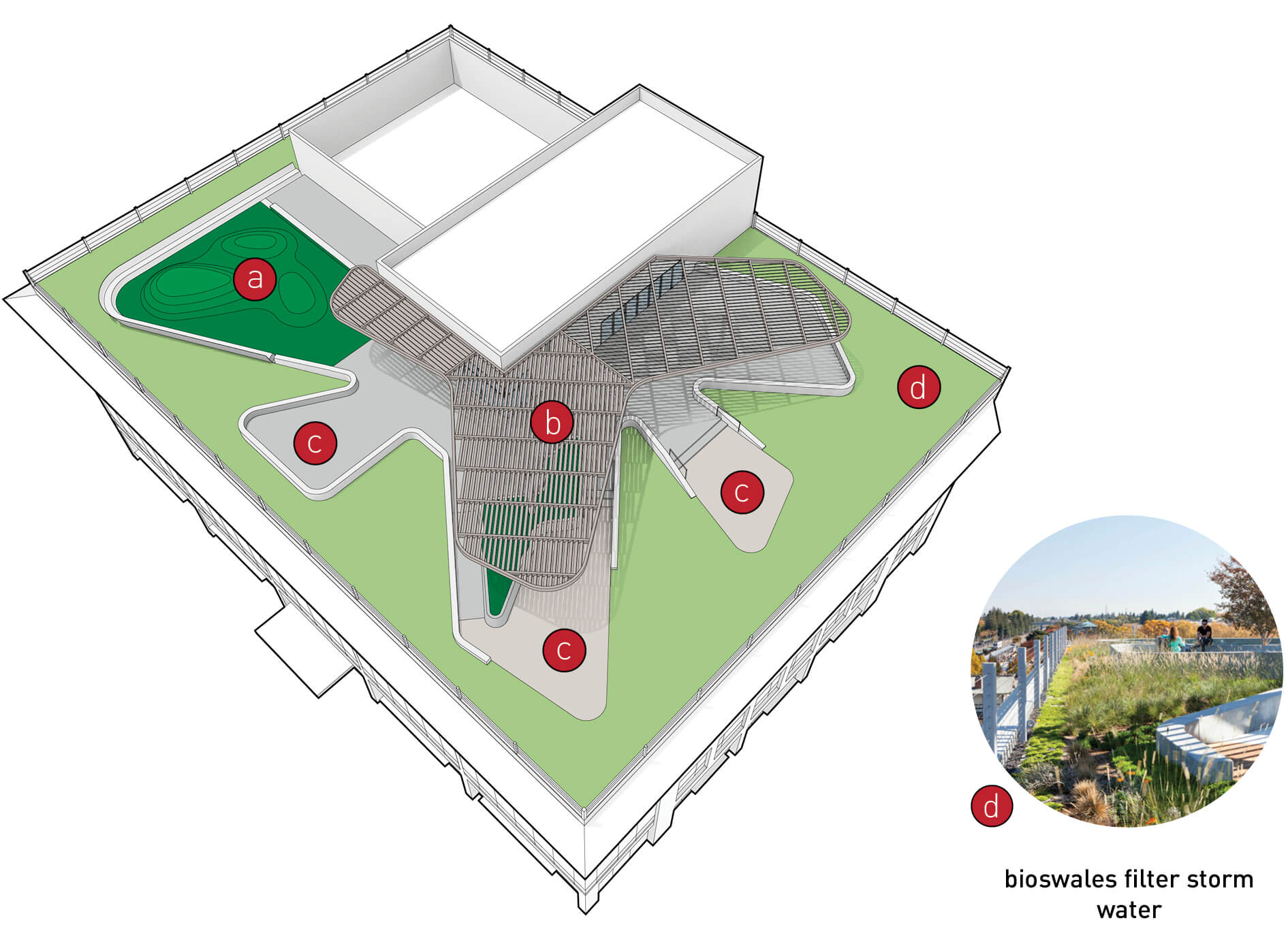 With the rest of the building designed, adding the green roof required a bit of extra height to accommodate the elevator and create sloped drains. The new design incorporated varying soil depths for plants and trees, as well as walkways and seating areas at differing heights throughout the space. A custom trellis allows employees to work outside with a laptop year-round without frustrating glare from the sun. Because the previously-specified elevator’s capacity dictated maximum occupancy for the roof, brick designed varied spaces and nodes of activity to limit the number of people in any one place, making the roof deck a more interesting place to be.