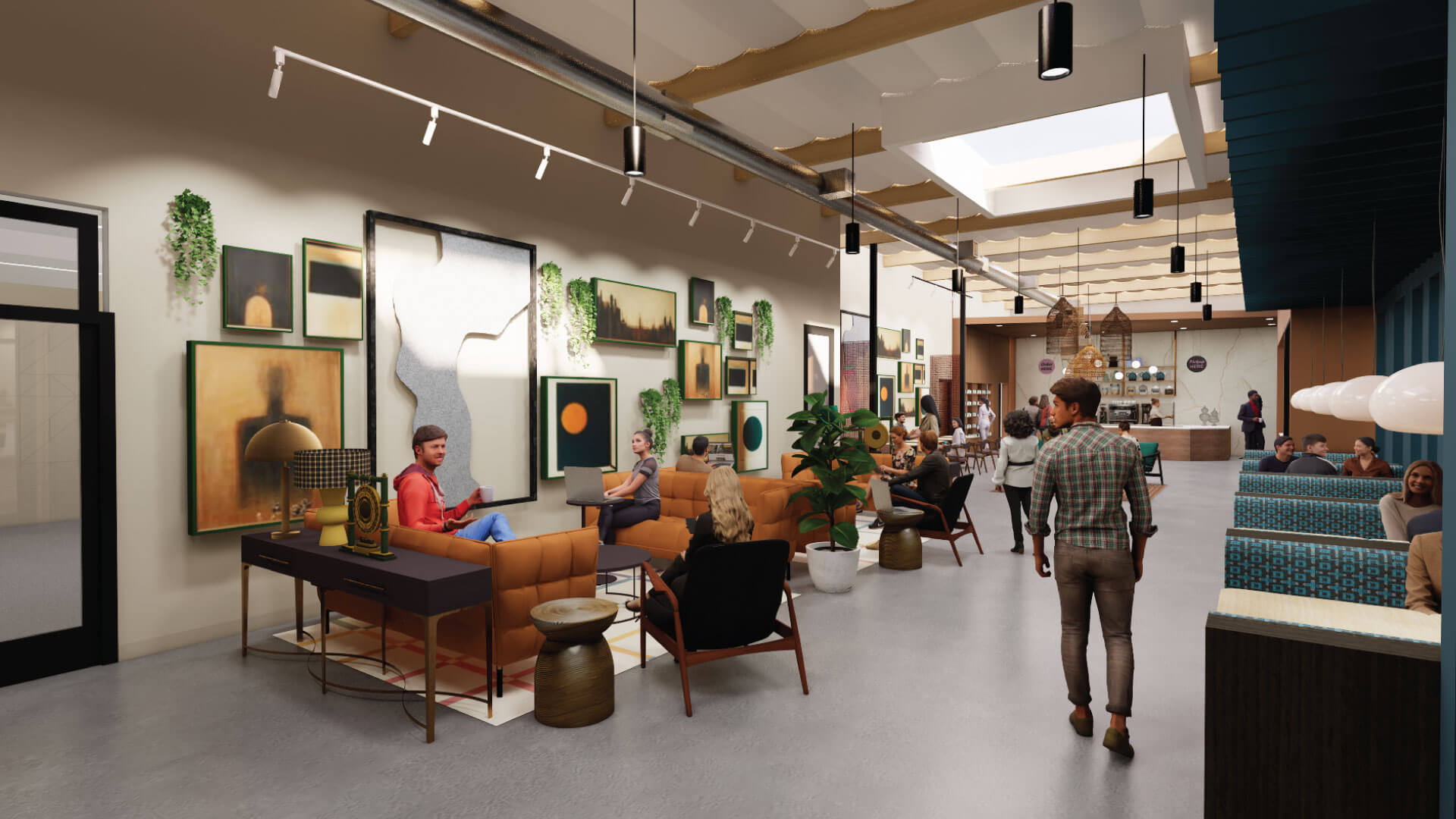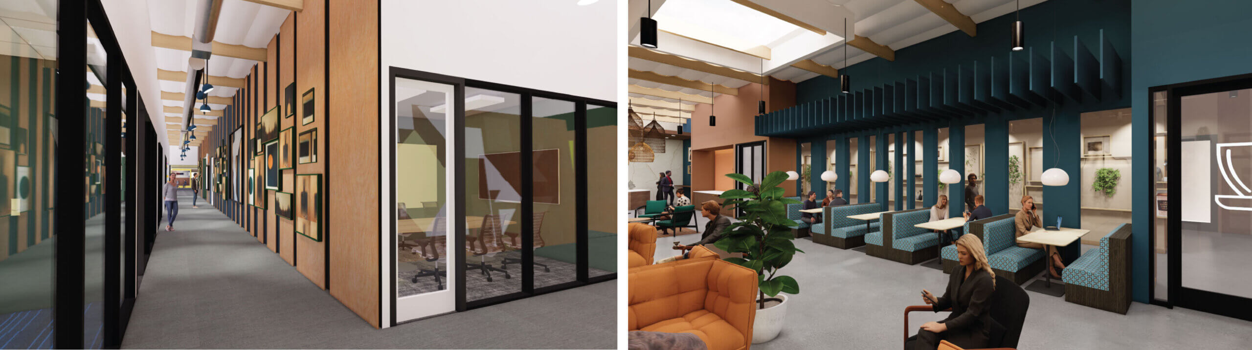 A thoughtfully sourced mix of reused furnishings and preserved artwork highlights material circularity while anchoring the workplace in memory, stewardship, and long-term value.