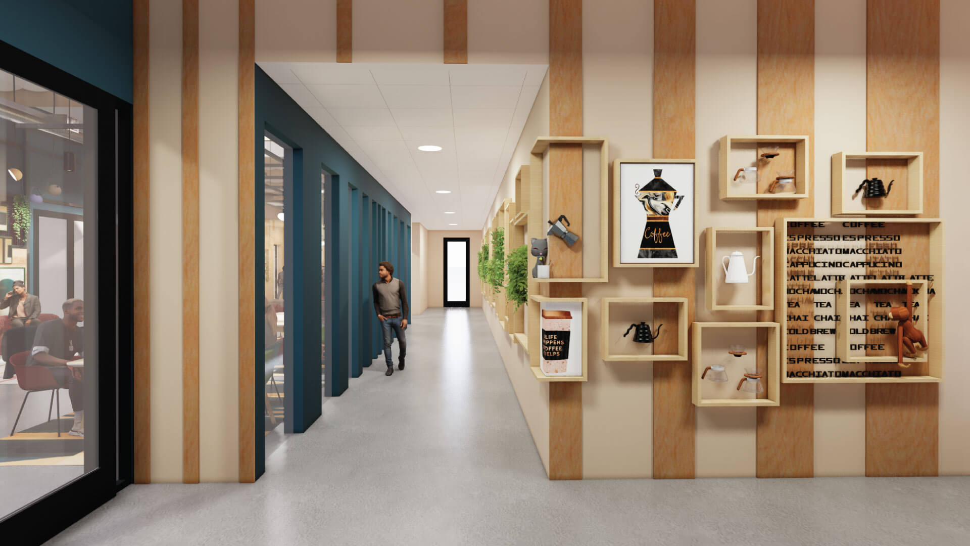This balance can be achieved through natural wood wall treatments and implementations of solid brand colors alongside carefully curated objects, to help limit unnecessarily busy patterns while still conveying a rich narrative. Wood not only brings in warmth and connection to nature, but it can also visually create layered depth without overwhelming a space. Additionally, layering invites the opportunity to develop comfortable, collaborative spaces with a home-like touch directly alongside spaces designed for specific modes of productivity, all tied together by the same cohesive company story.