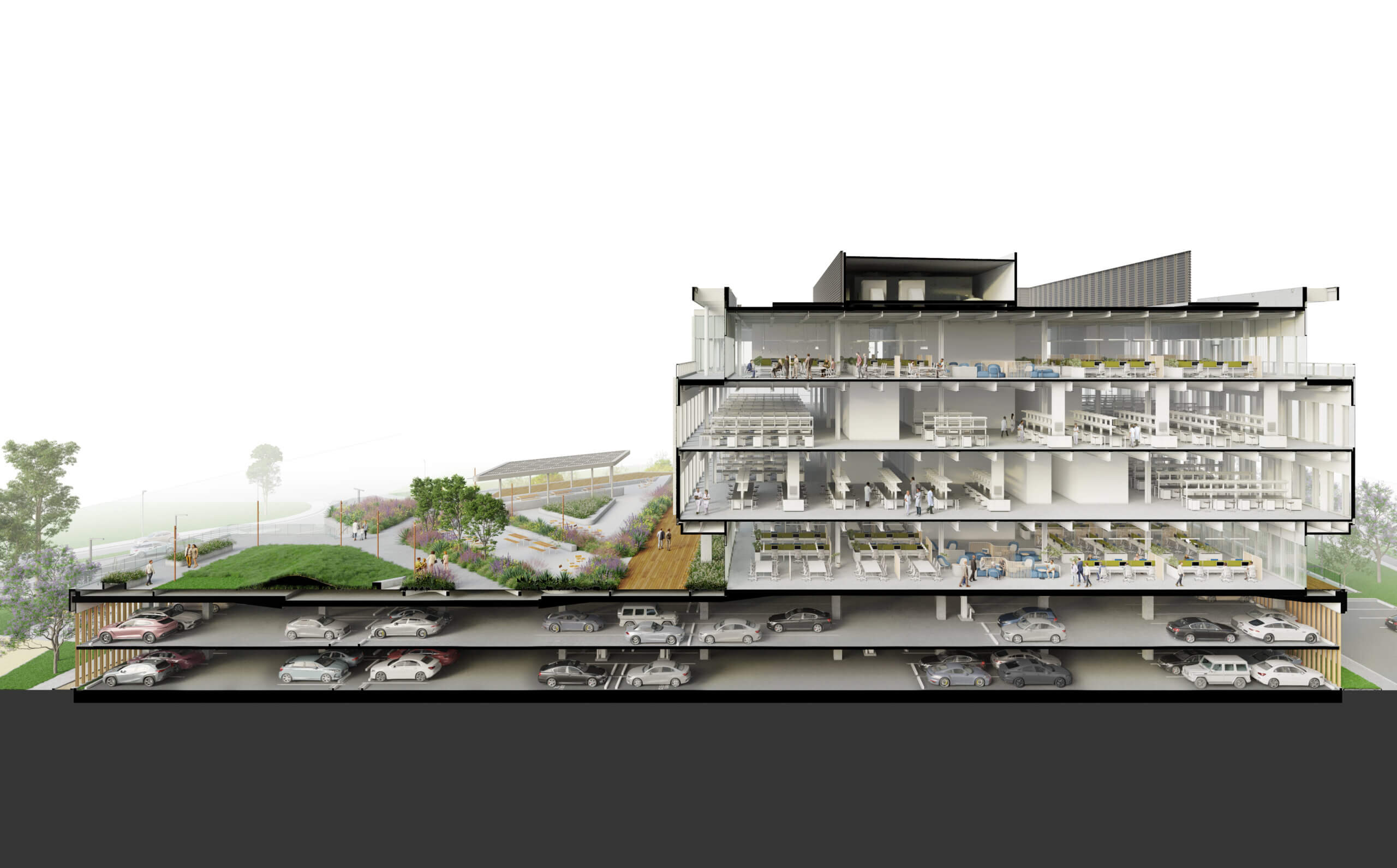 The project proposes 36,000 square feet of accessible public park area with views of the lagoon. We envision this an event space as a place of respite for bikers, runners, dogs, dog walkers, and everyone else who would like to take a break and enjoy the beauty of the natural surroundings. People will find places to sit; a catered food truck program to offer the area with expanded food options; unique elevated perches to enjoy views across the lagoon as well amphitheater seating and an informal stage for performances and musical acts. This redevelopment and park will offer much needed space for the emerging life science market and the activated landscape will create a positive addition to the pedestrian experience in Redwood Shores.
