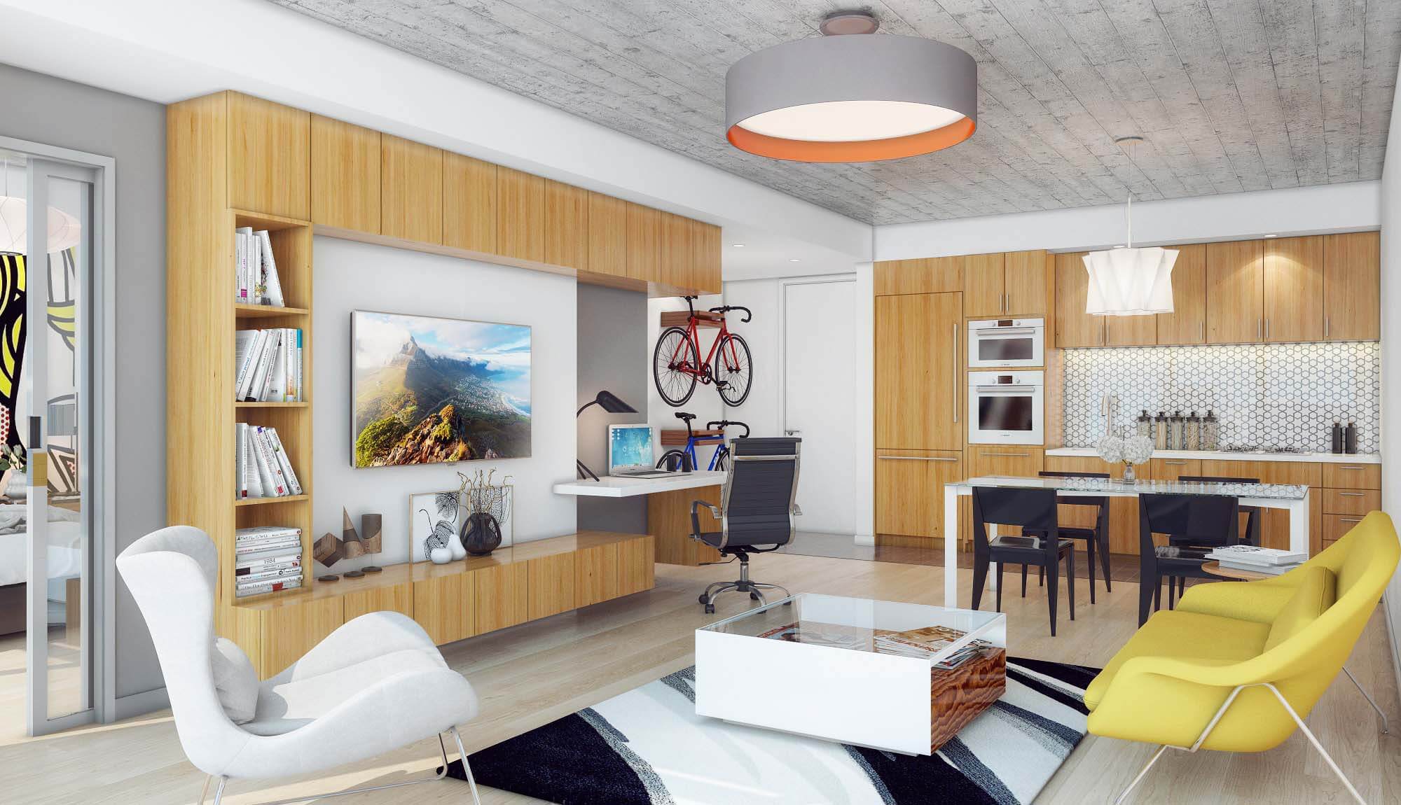 Design features include premium interior finishes and millwork using ecologically sustainable materials, as well as space for two bicycles in each unit. The apartment units are highly efficient, utilizing functional design elements to streamline use of space.