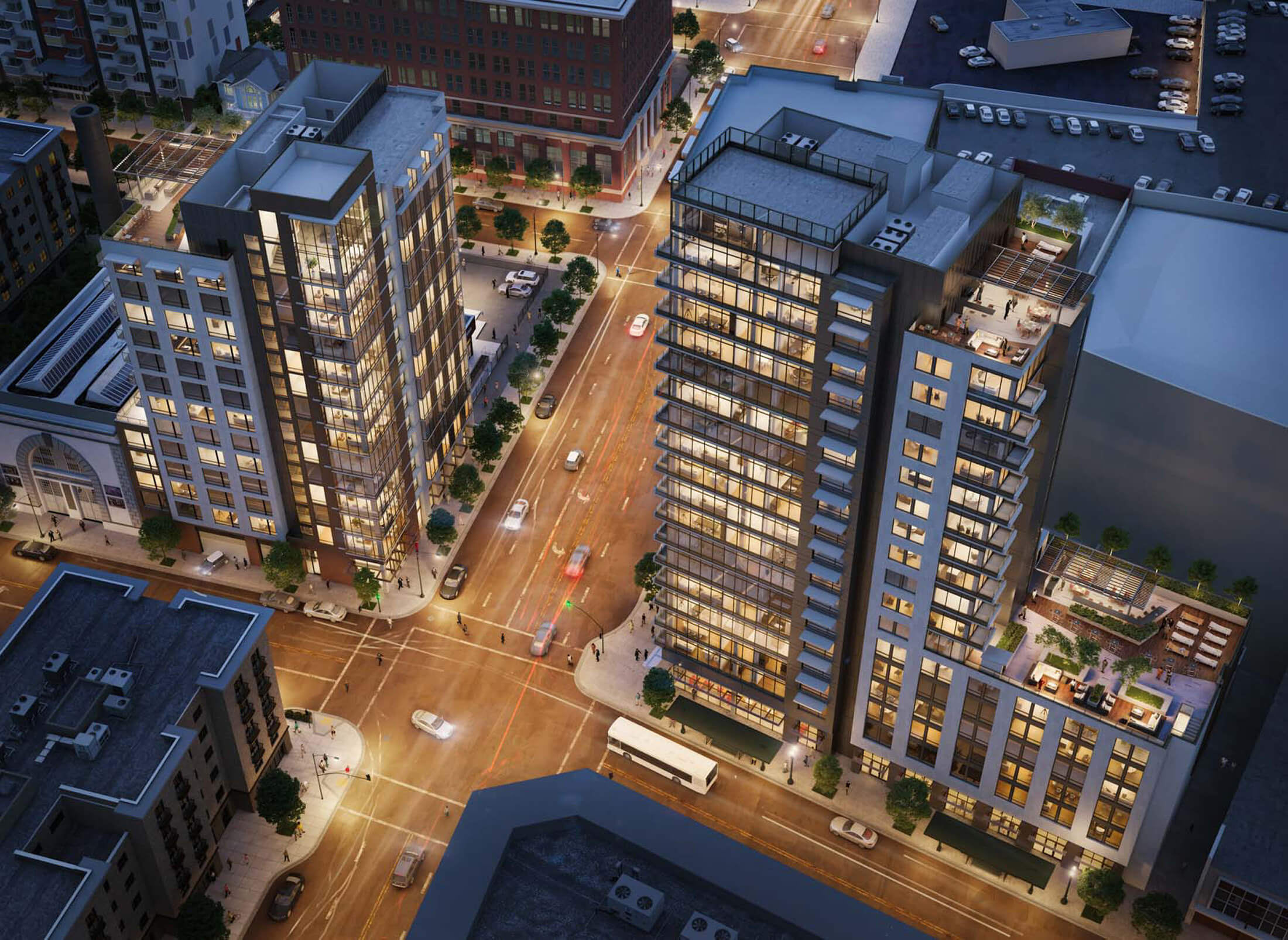 The 14-and-18 story mixed-use buildings are constructed with concrete, including ground-level resident parking, a welcoming lobby, and retail spaces facing Telegraph Avenue. Residential amenities include a fitness center, theater, and expansive rooftop decks featuring open lounge and recreation areas, kitchen and grill stations, and a community garden – surrounded by panoramic views of the San Francisco Bay.