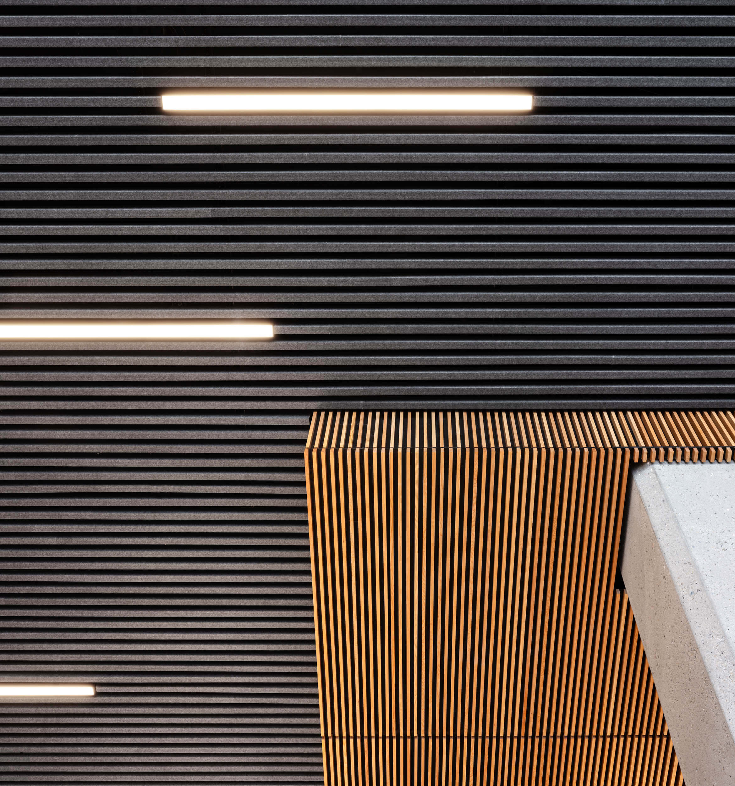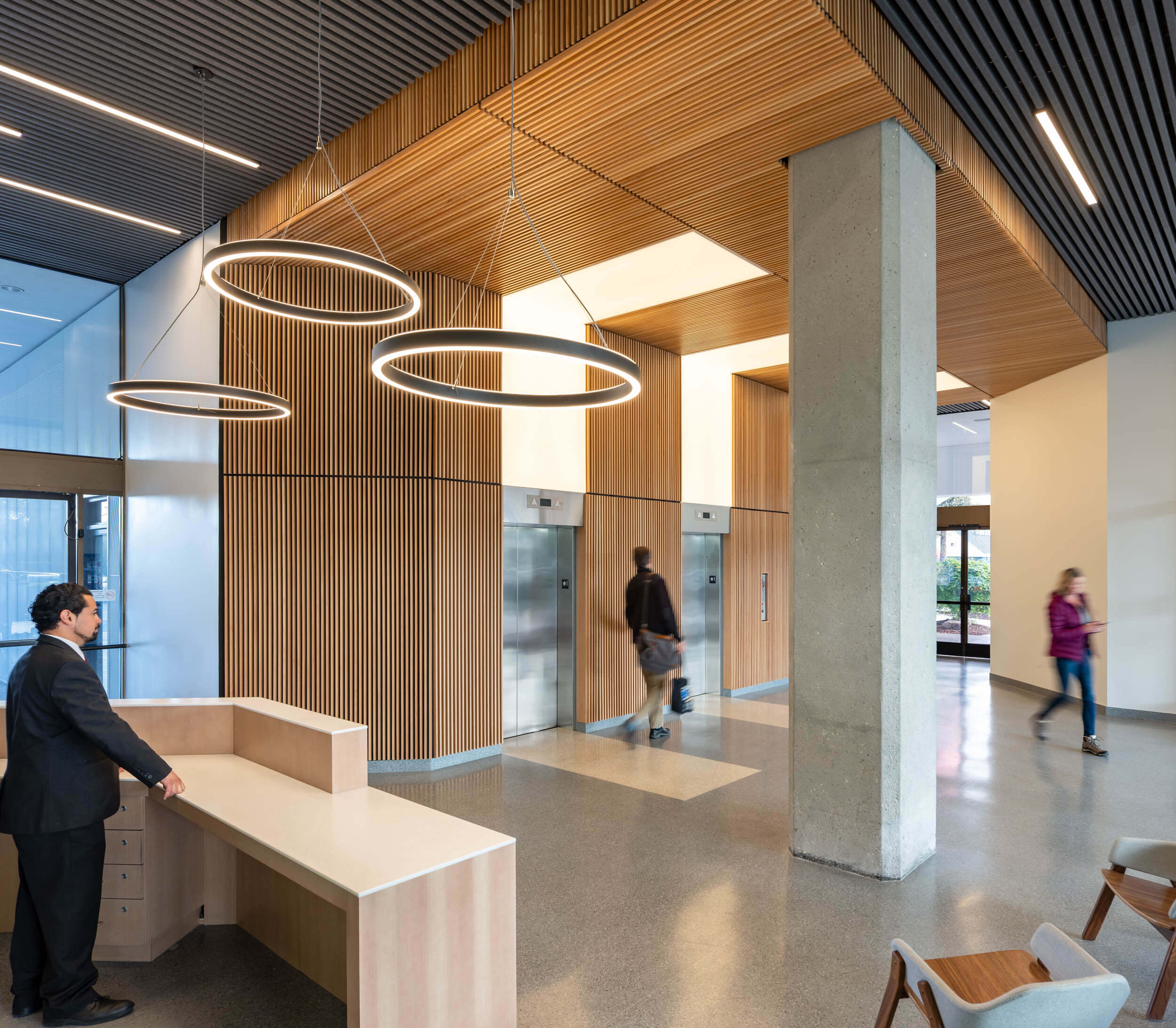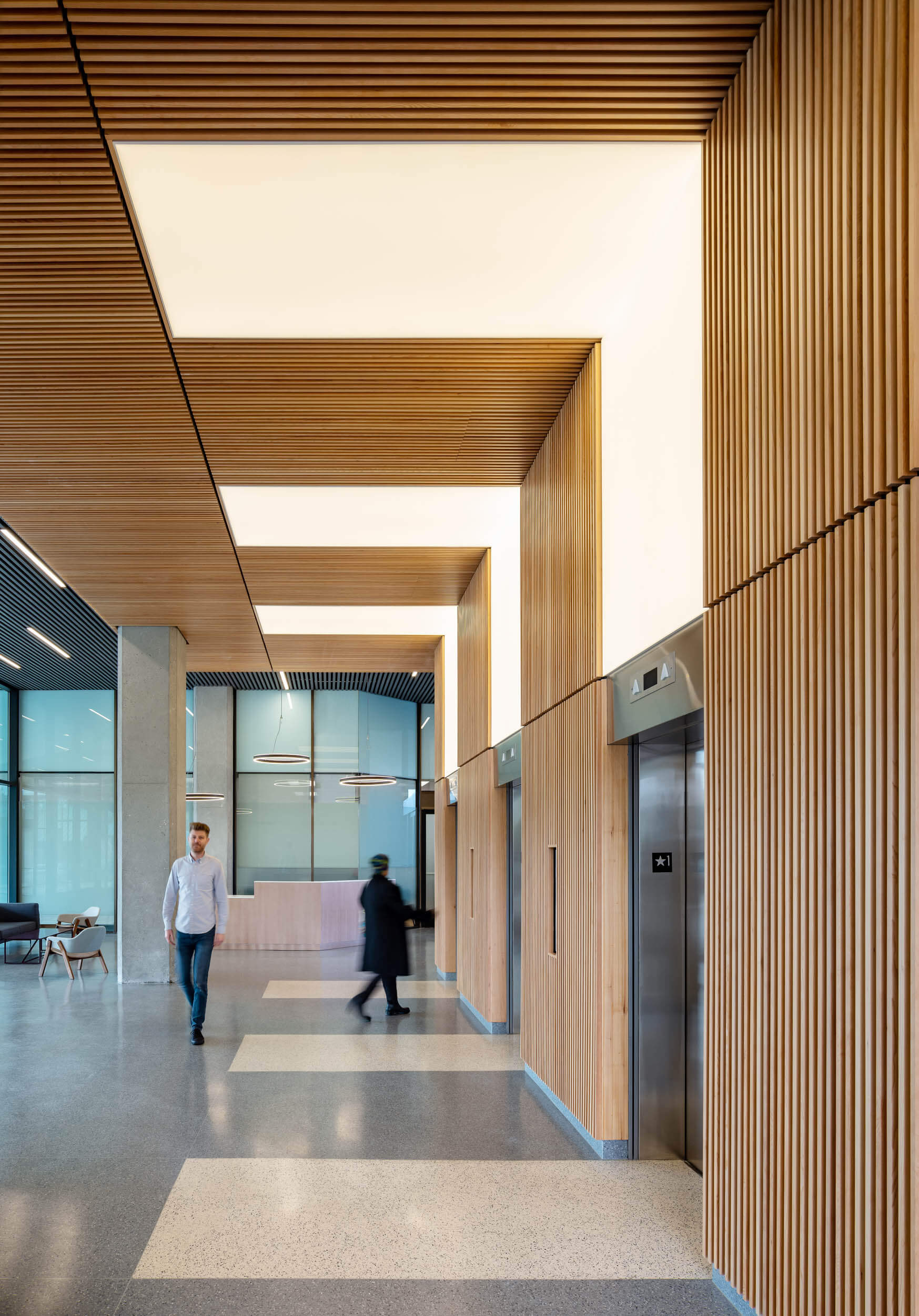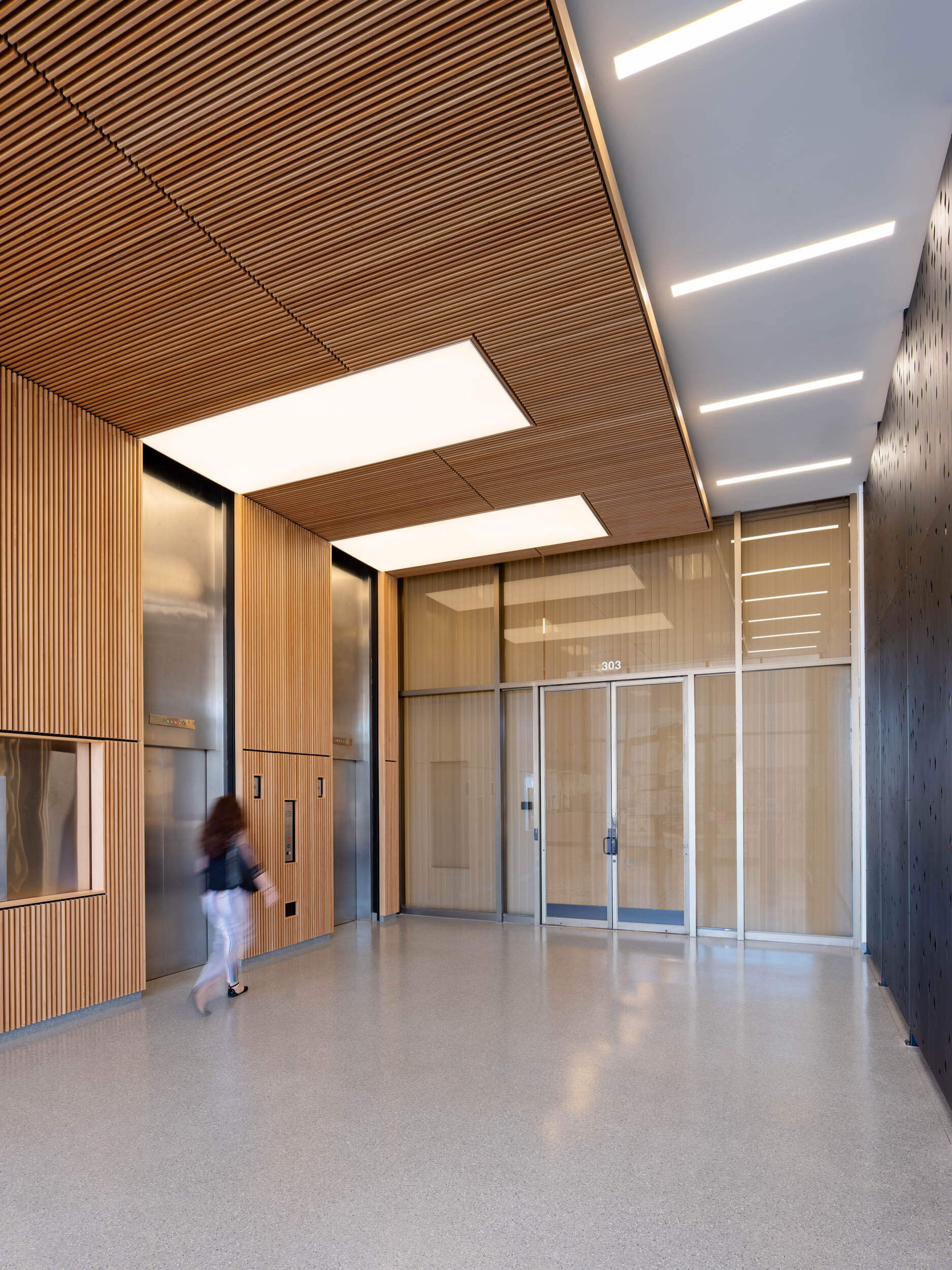The elevators become a focal point with a unique wood slat treatment and dramatic lighting. A cafe is planned for the ground floor. The result? Even before the interiors were complete, the client was signing longer leases for larger spaces and big increases from historic rents.