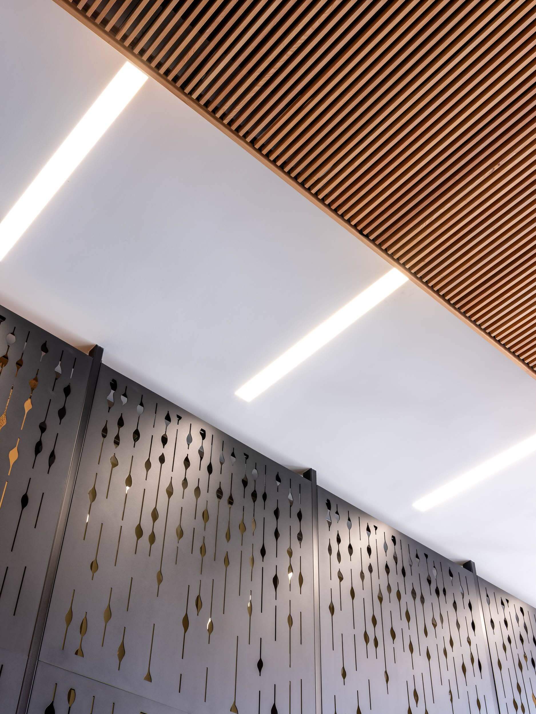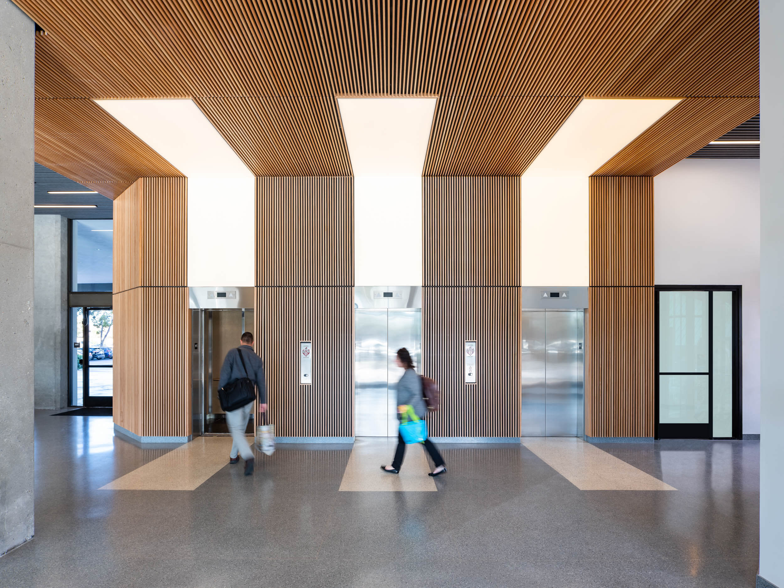 Felt acoustic panels play with the linear wood slats and slivers of light on the ceilings. In the 303 Hegenberger Lobby, a dramatic metal panel wall designed by Annie Kantor acts as a privacy screen and allows seeds of light to peek through. The themes of natural materials, visual texture and sleek lighting is consistent in the lobbies and elevator landings on all floors with a subtle painted graphic that is unique to each floor.