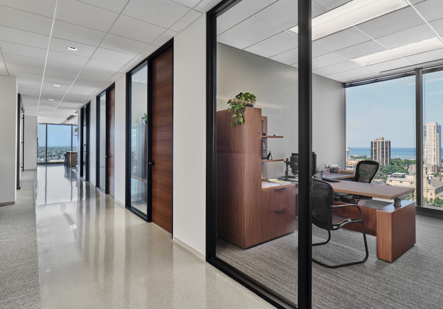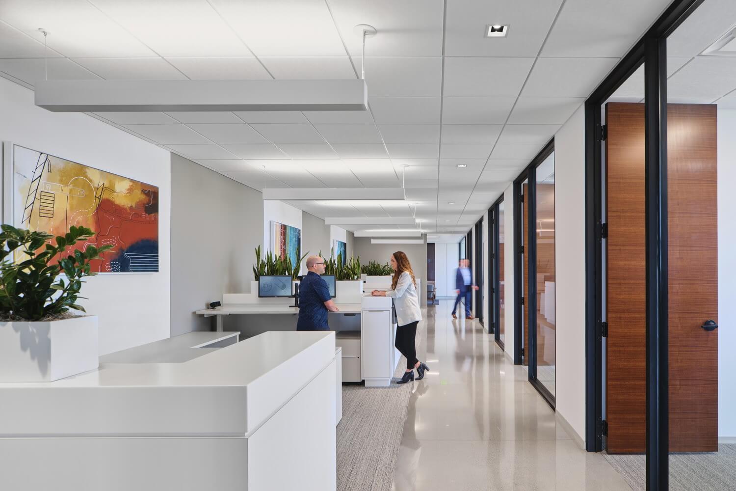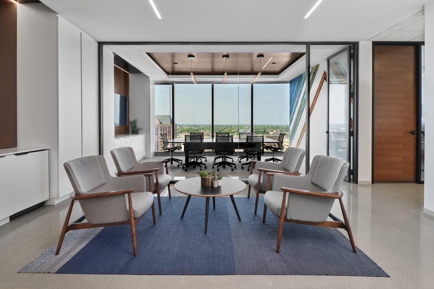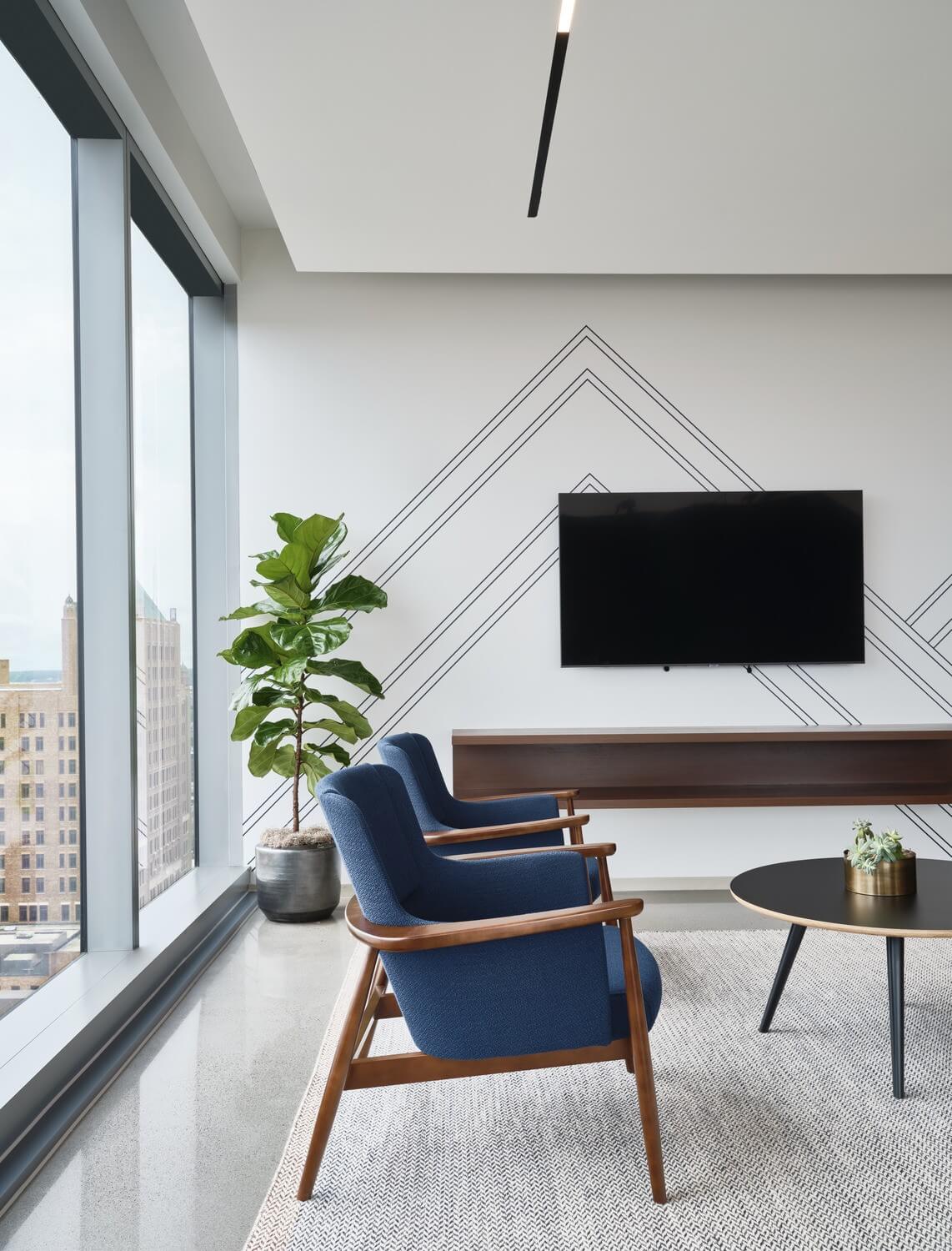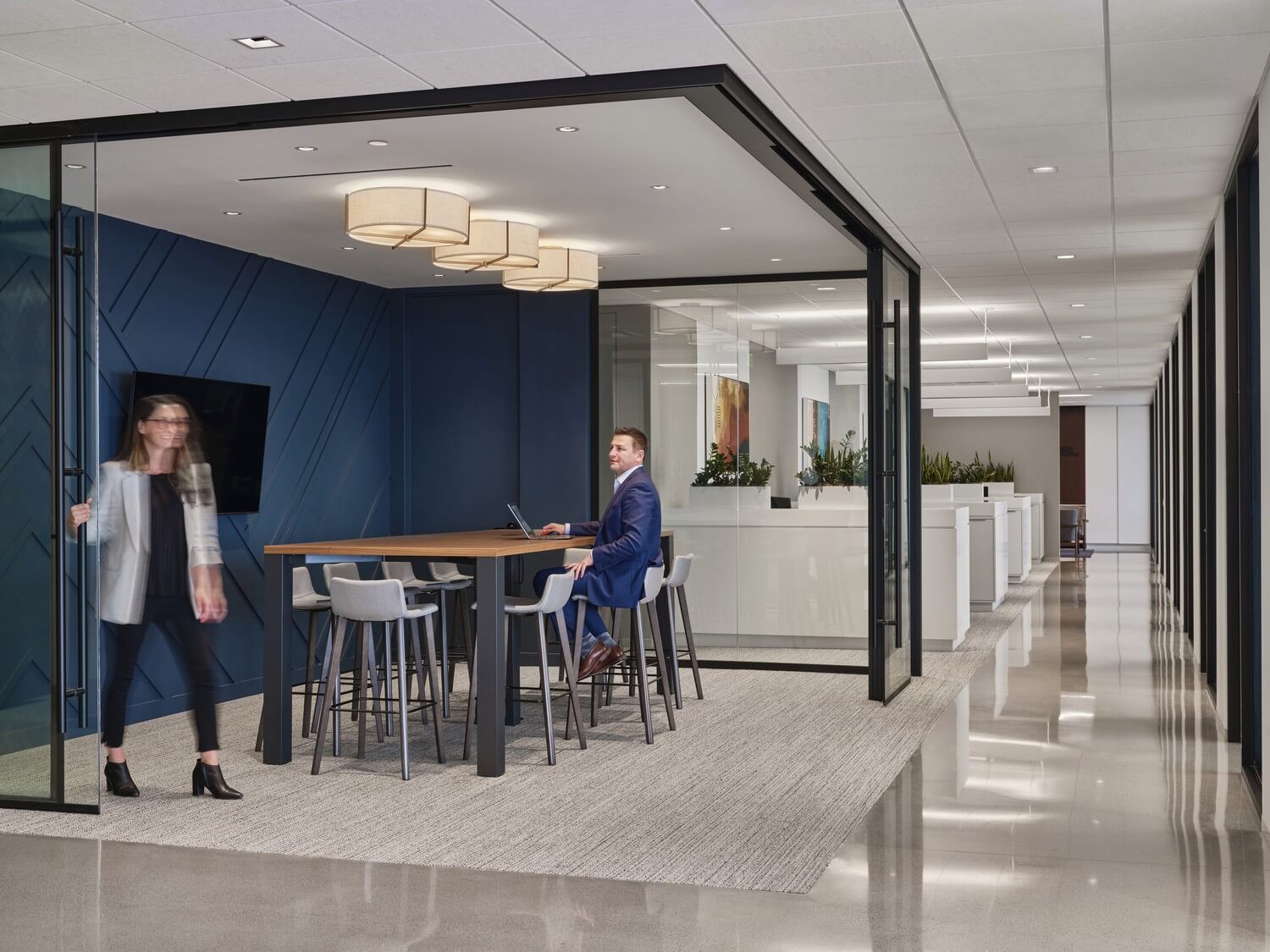 When Andrus Intellectual Property Law needed a new space for just the third time in their eighty-three year history, they turned to HGA to provide them with a timeless design that spoke to both their past and future. Central to their culture is the connection to Milwaukee and their long history within it. As they thought about their new space, they knew both would need to play prominent roles. From the moment you come off the elevator, you’re greeted with spectacular views of Milwaukee through full-height glass doors, a light and open reception area, and a transparent conference room. An egalitarian approach to daylight and views drove the design and resulted in the corner break room at the heart of the office which provides all employees a place to gather and enjoy the City. Aesthetically, Andrus wanted to see themselves in the same space twenty years from now. HGA spent several client meetings listening to the Andrus team to understand their culture and vision. This deep understanding helped HGA tap into what really mattered to them and craft a physical space that embodies Andrus’s vision; one that is approachable, neutral, and modern. Seeking this insight built trust and lead to opportunities to expand services that enhanced the company’s brand identity.