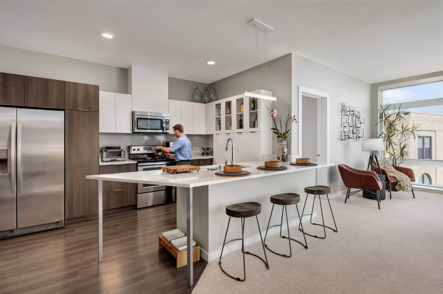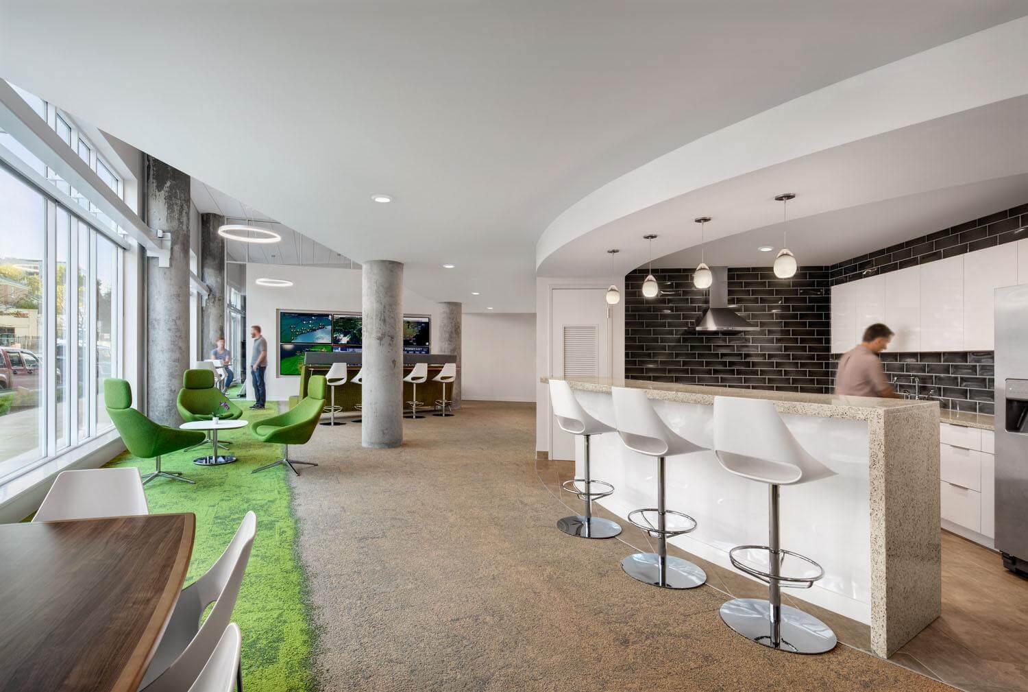 The six-story building’s main façade curves along North Water Street, an important downtown thoroughfare. To take advantage of commercial opportunities, a 29,500-SF market was integrated into the building. The remainder of the building contains 168 luxury apartments that feature loft-style interiors and finishes as well as floor-to-ceiling windows. Tenants have access to such amenities as a fitness center, a clubroom, a pet-wash room, a bicycle repair shop, and a car wash studio. Visitors are impressed by the light-filled, two-story lobby, accented by a wood paneled fireplace, wood ceilings, colorful pendent lighting, and a live-wall sculpture.