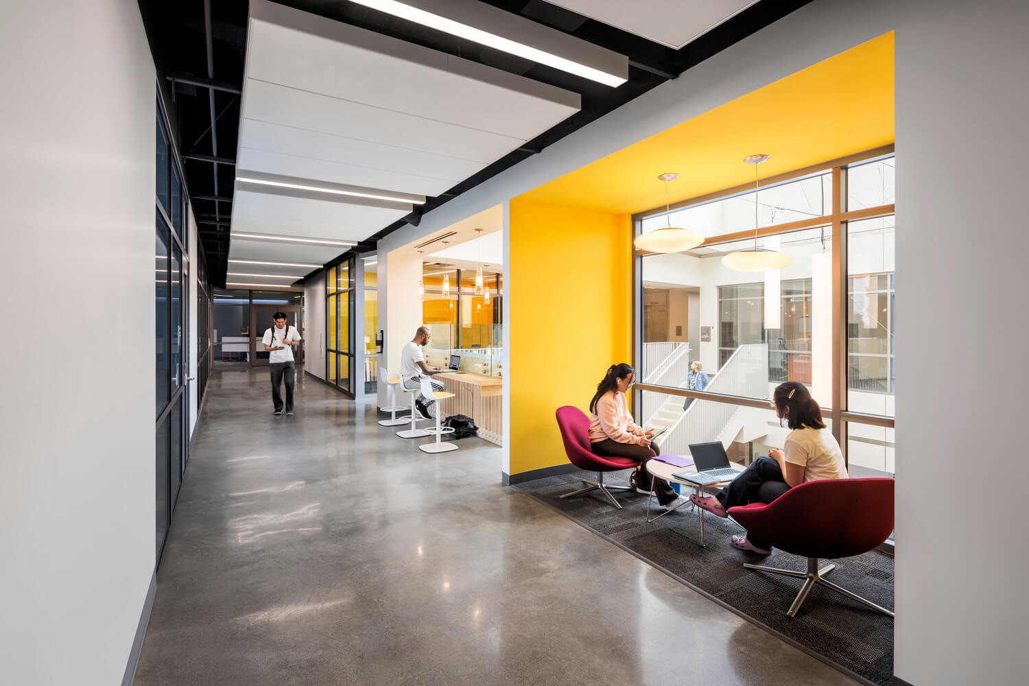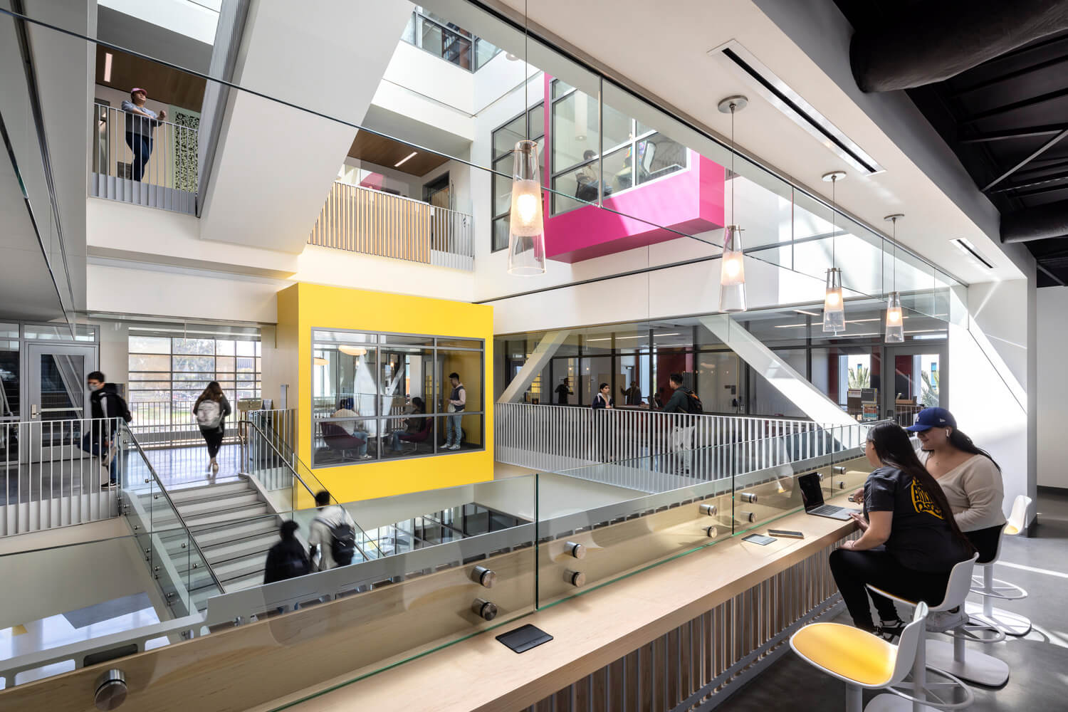A large four story lobby space welcomes students and visitors to the building and includes event and gathering space for classes, banquets and meetings with a large media wall. A central open stairway connects all four levels of the building enhancing visibility of programs and interaction of students, faculty, administration and the community.