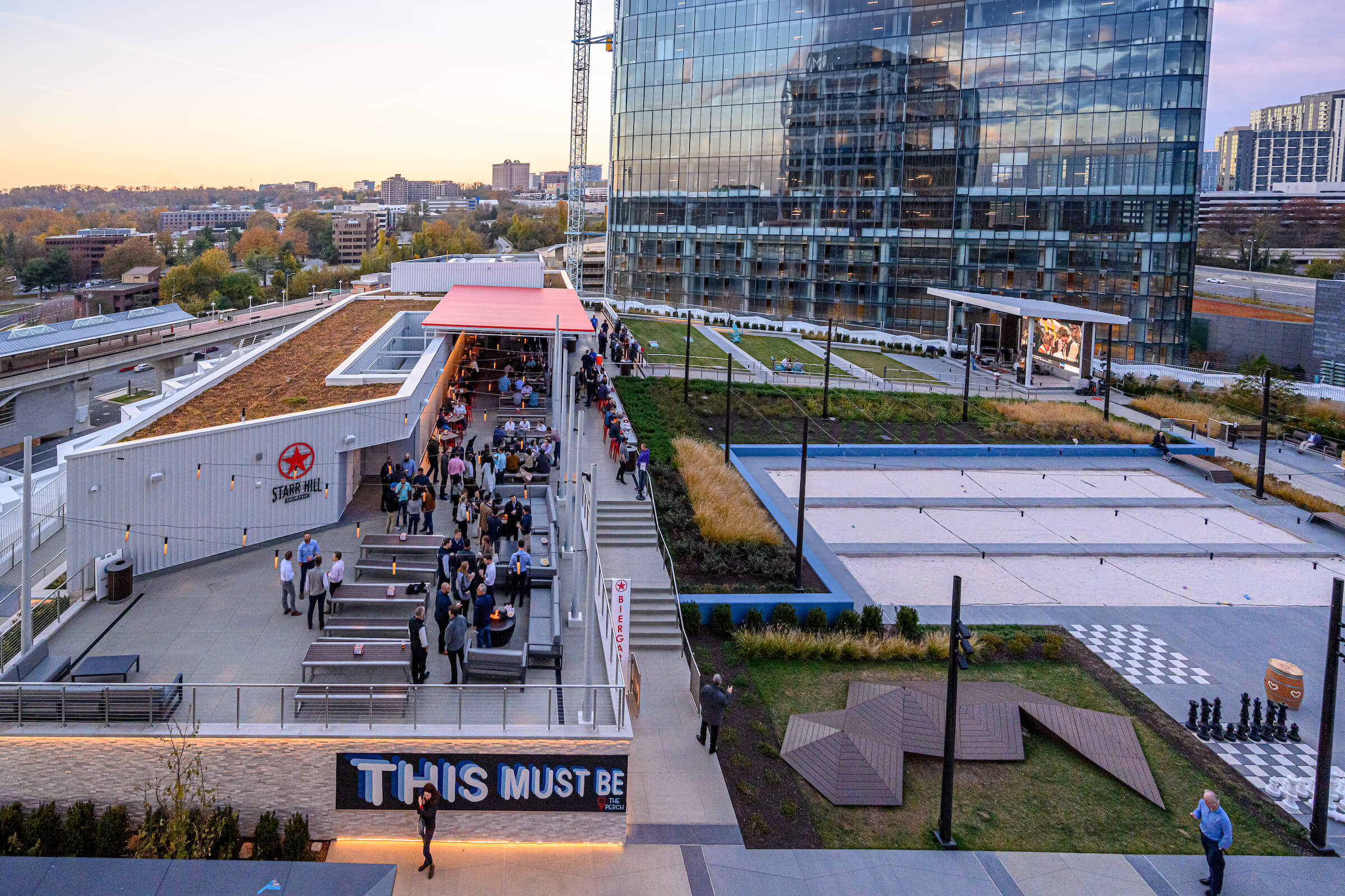 The Hall stands at a hub of multi-modal transportation options, where pedestrians, cyclists, Metro riders on the Silver Line, and drivers can come together to enjoy the convenience of a dynamic live, work, play environment enhanced by some of the area’s most unique offerings. The building itself brings together key features of urban life, including a street-level grocery store, state-of-the-art performance and event spaces in its interior (The Atrium: 1,300-person flexible space, The Vault: 225-seat black box theater, The Main Theater: 1,600-seat performance hall), and a fully landscaped rooftop park (The Perch), featuring a biergarten, open-air amphitheater, bocce courts, and sculpture garden. Also included in the program are conferencing and meeting rooms, gallery areas, terraces, and bars/concession stands.