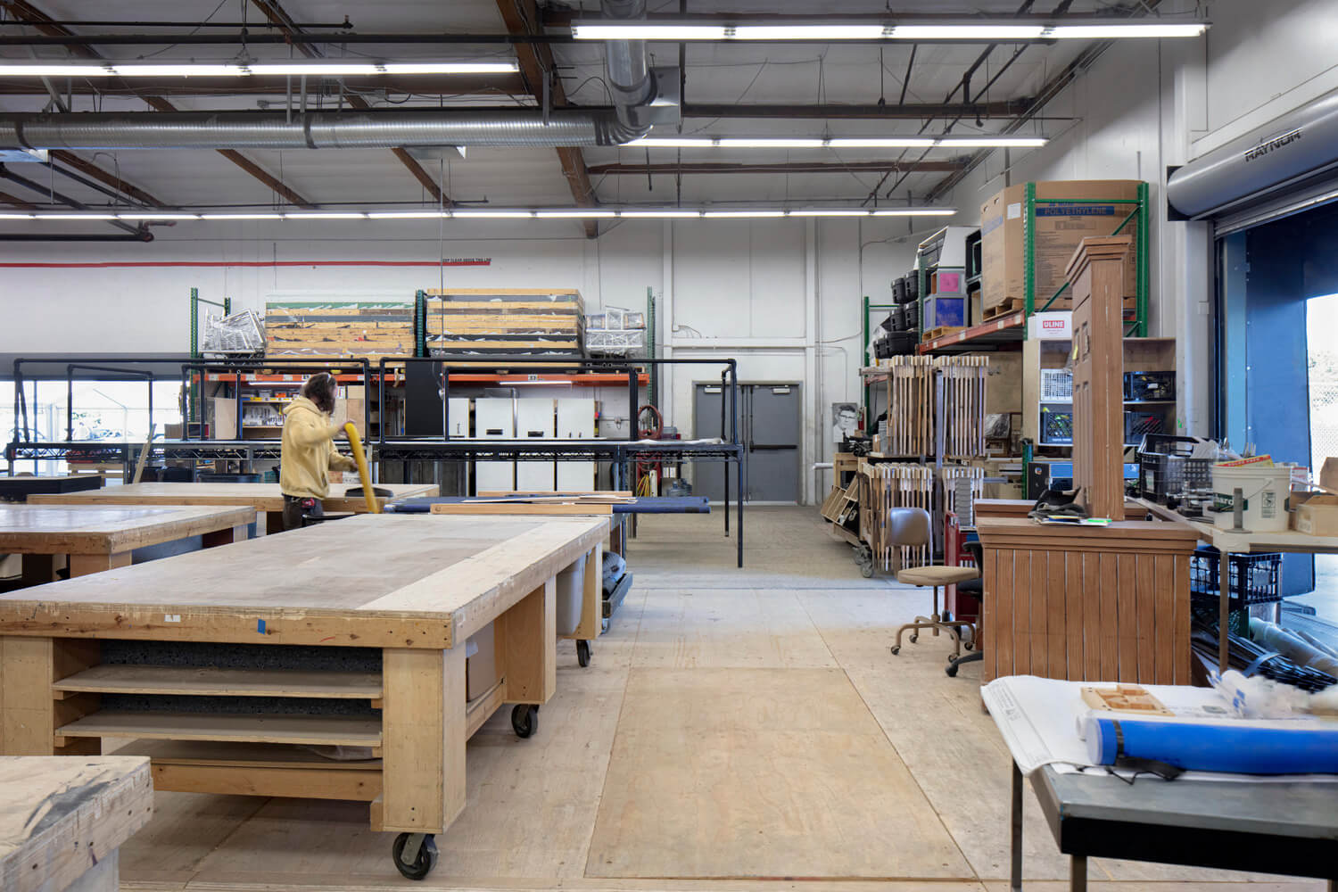 Understanding of user types was critical to space planning to create efficiency and make the space easy to use. Designers approached the project by defining user personas and determining their needs. This included the CMT staff who require a traditional office environment; students, with varying drop off and pick up procedures, who need a community room to gather and store their belongings; set builders, who required a full shop with rolling garage doors to move sets; parent volunteers, who need a robust costume storage/alteration room; and the space had to accommodate catering/food service for special events.