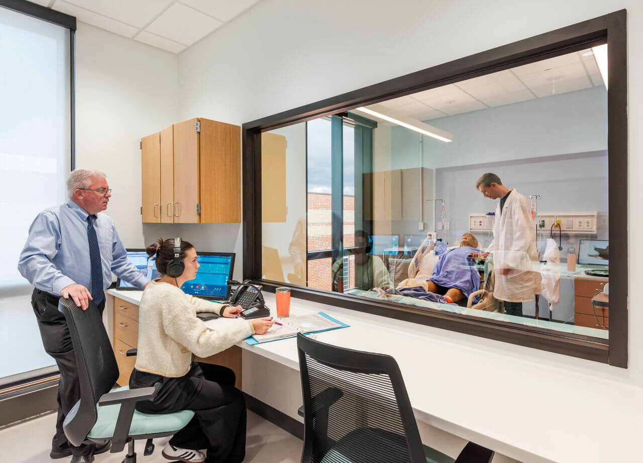Designed to promote engagement and collaboration, the first floor of the building features a diverse range of spaces, including a café, quiet areas for focused study, and larger spaces for student-faculty interaction. As one enters the second floor, the building transforms itself to simulate a hospital environment and allow for hands on learning, featuring spaces like two high-fidelity simulation suites and an open layout for skills training, as well as exam rooms and debriefing spaces. The building’s welcoming main entry along the East-West pathway integrates the Center into the heart of campus, bringing key programs together in a modern, state-of-the-art facility.