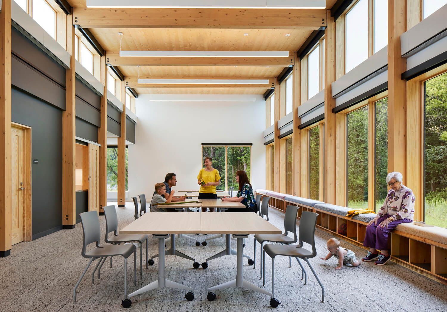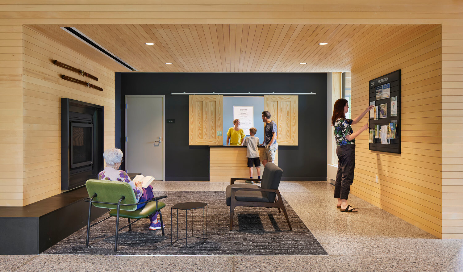The new Lower Landing Facility is just over 6,000 SF and features a warming lobby, parks and recreation office, a rentable multipurpose space with kitchenette, equitable restrooms, park storage and a covered picnic area. The site design includes rerouting the park’s ski trail to further activate the building as well as adding two exterior gathering spaces that orient park visitors to the trail.