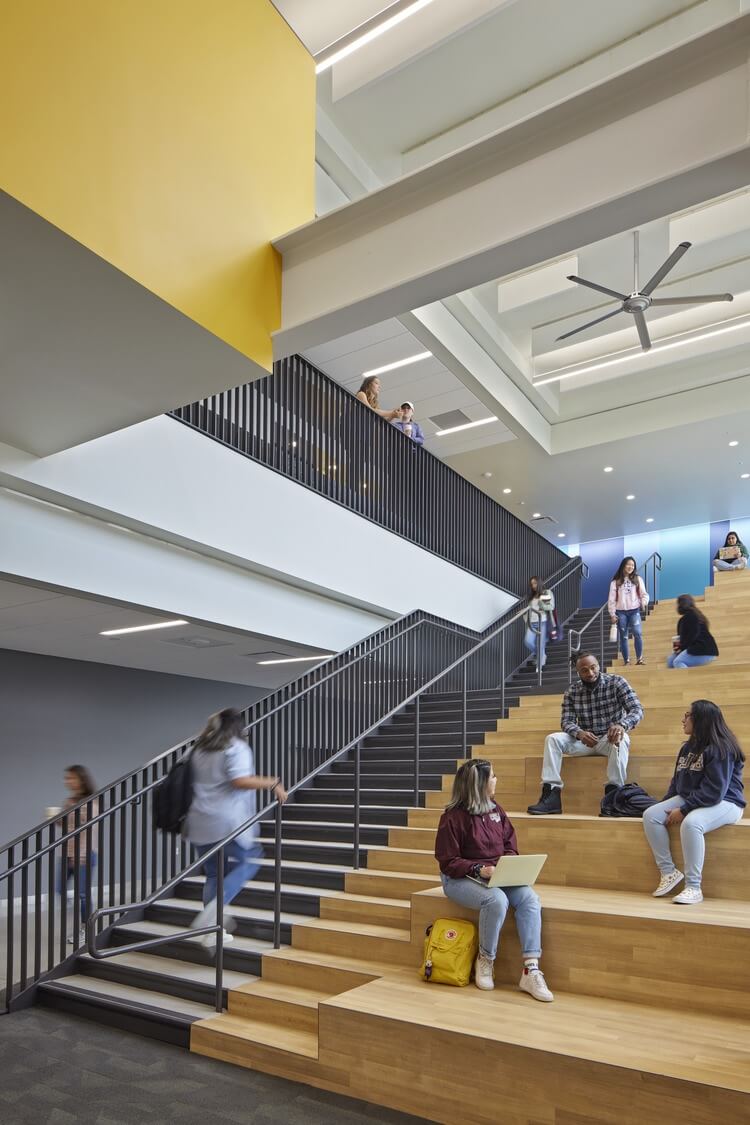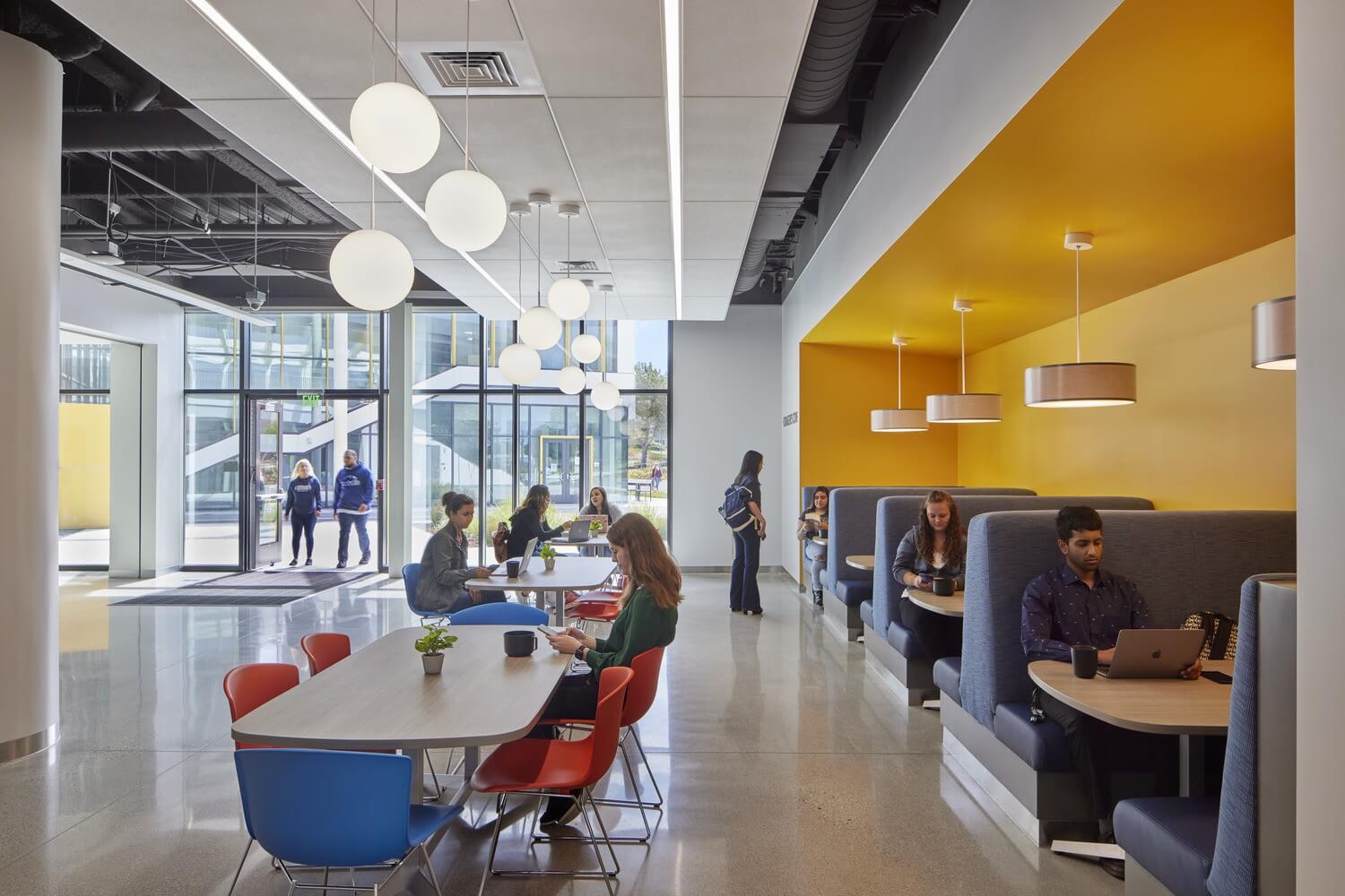 The goal was to design an inclusive environment for a diverse student population and provide amenities that create a ‘living room atmosphere,’ where students can socialize, collaborate, and study under one roof—within an equitable and versatile backdrop for student life. The building siting captures sustainability best practices, maximizing natural daylighting and shading with a design that yields a symbiosis of indoor and outdoor gathering space and provides a welcoming transition from the Main Quad. Natural cross-ventilation opportunities were created by reducing the building depth and forming a “U” shape building footprint.