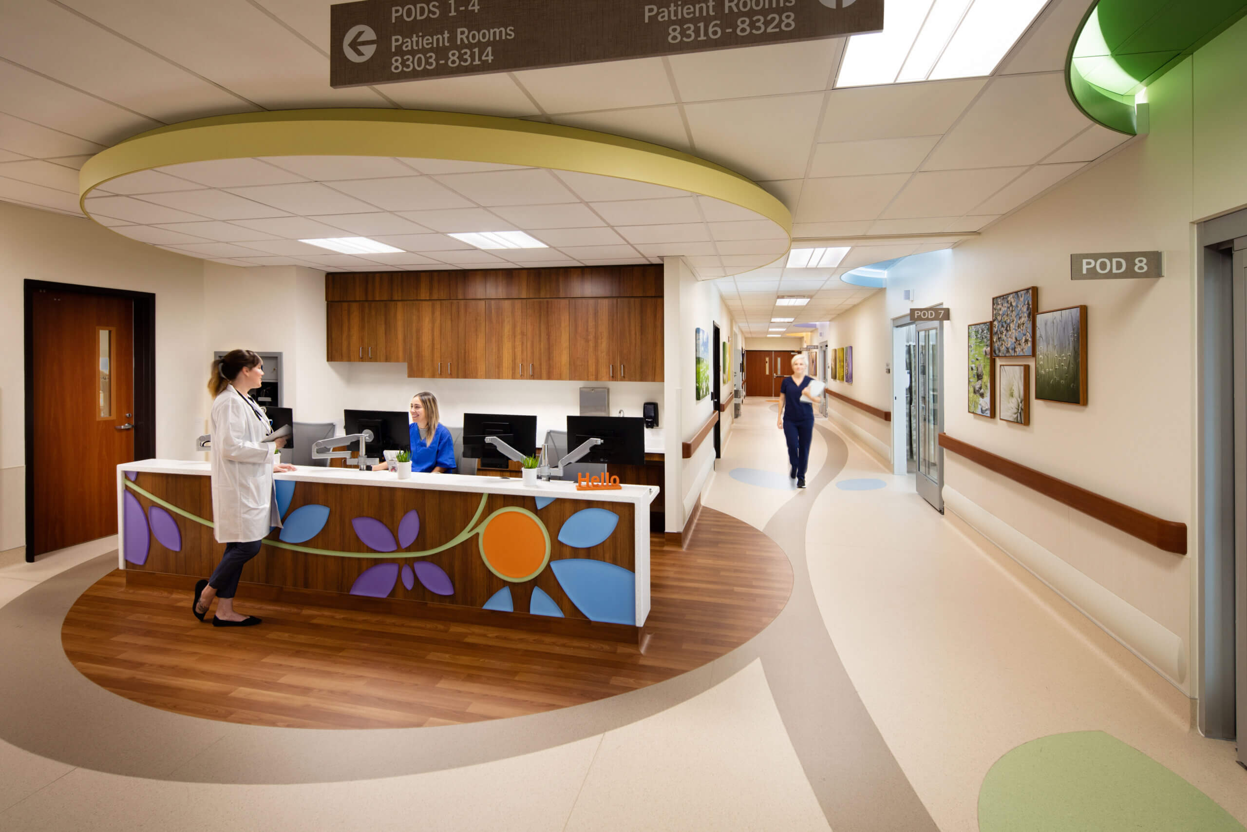 The inviting interior features a simple, nature-inspired palette of warm whites, crisp greens, soft blues, and abstracted botanical forms, such as flowers, leaves, stems, and vines—reminiscent of paper crafts and children’s art. Raised and lowered ceiling planes frame focal areas and delineate nurse-station locations. Strategically placed indirect cove lighting creates warmth and aid in wayfinding. Wood and fabric textures further evoke comfort and warmth. The light-filled waiting room features seating for adults and child siblings. A large-scale graphic collage of children’s faces—the NICU graduates—projects a sense of hope for current patients and their families.