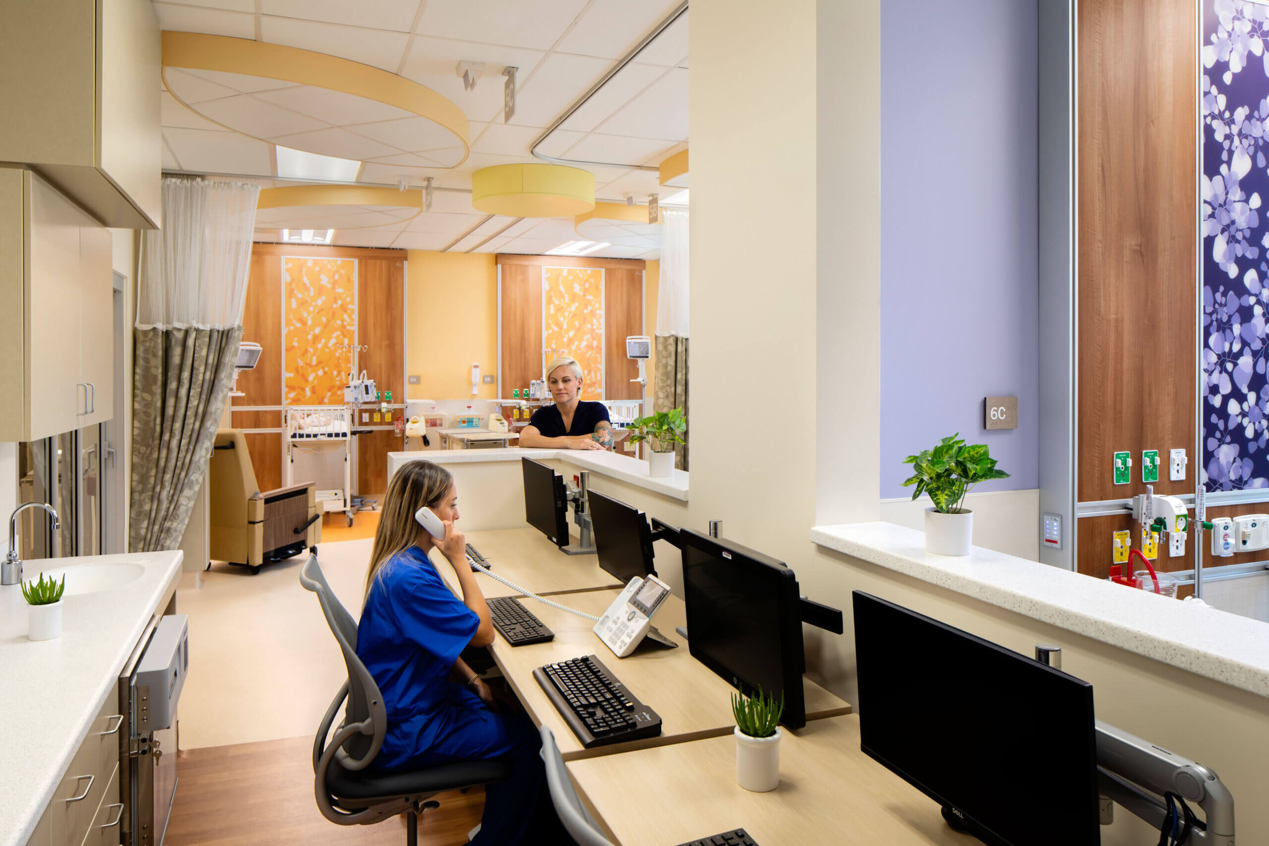 The 17,889 SF NICU includes 24 beds grouped in eight three-bed pods, 16 private critical care beds, overnight family space with pull-out sofa in patient rooms, decentralized nurses’ stations, family waiting room, and bridge connection to Birth Center in original tower. Additionally, four critical care rooms flexibly convert to isolation rooms, two of which allow equipment to be removed and concealed creating a calming environment for parents to be alone with their terminal child.