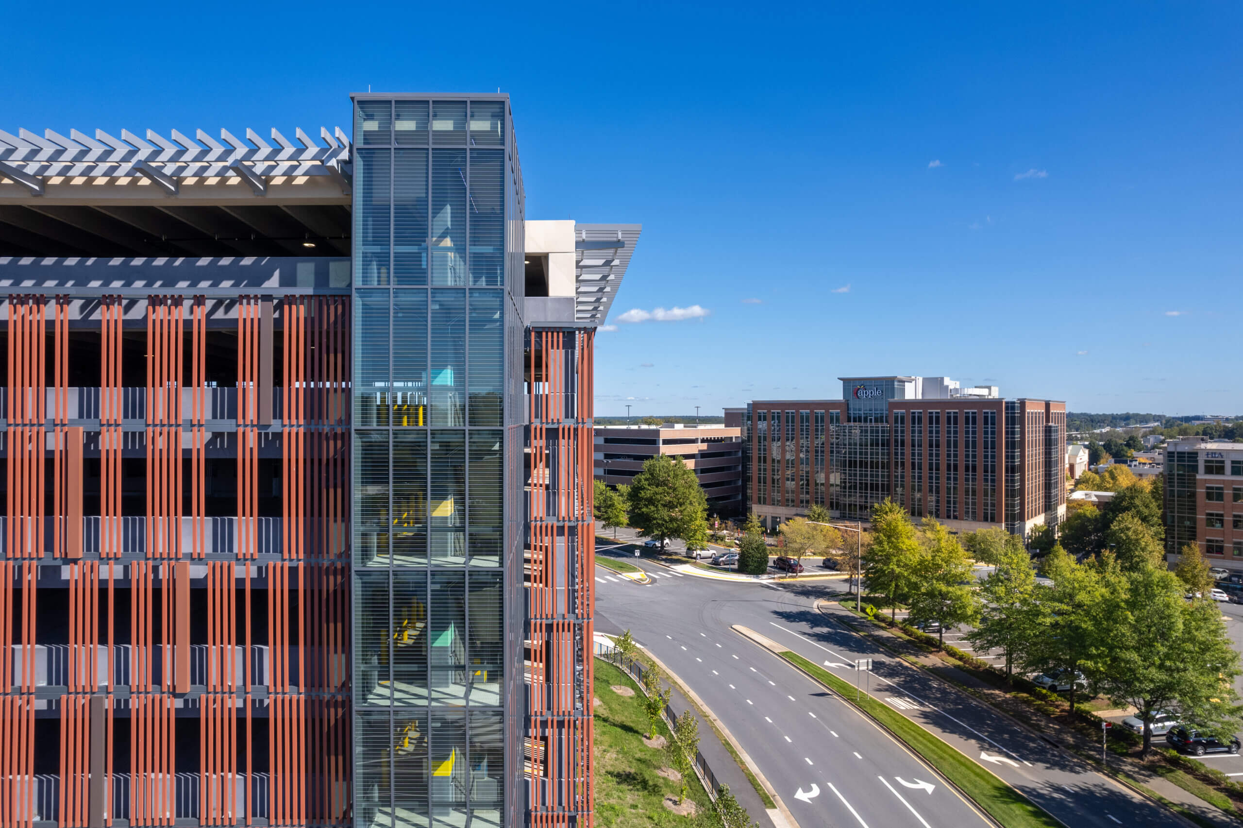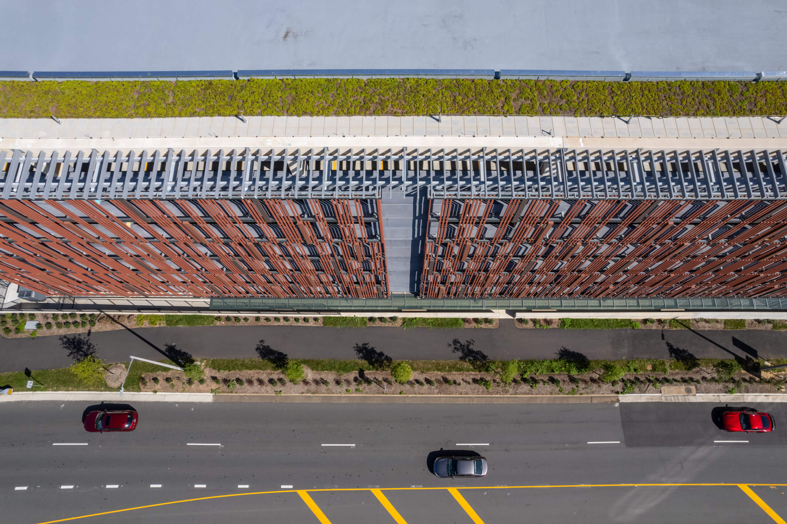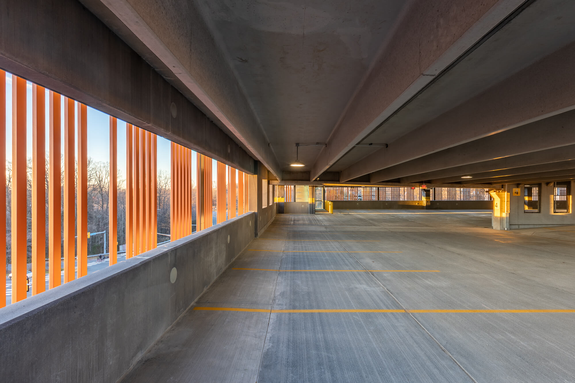 Longtime client Fairfax County has a commitment to design excellence and sustainability. We are privileged to be leading the design of their first GBCI ParkSmart parking garage. Product of the county master plan, this innovative multi-modal facility is the first to accommodate a ground floor “Slug” ride share transfer station and supports eight levels of parking (820 spaces) topped by full photo voltaic array. A single-story, tensile fabric pavilion covers an eight-bay bus terminal. Countering the client’s preconception of an in-building, ground-level bus terminal, the team introduced cost savings, clarity to site circulation, and enhanced user safety with the now segregated bus terminal pavilion. Building and landscape are in motion.