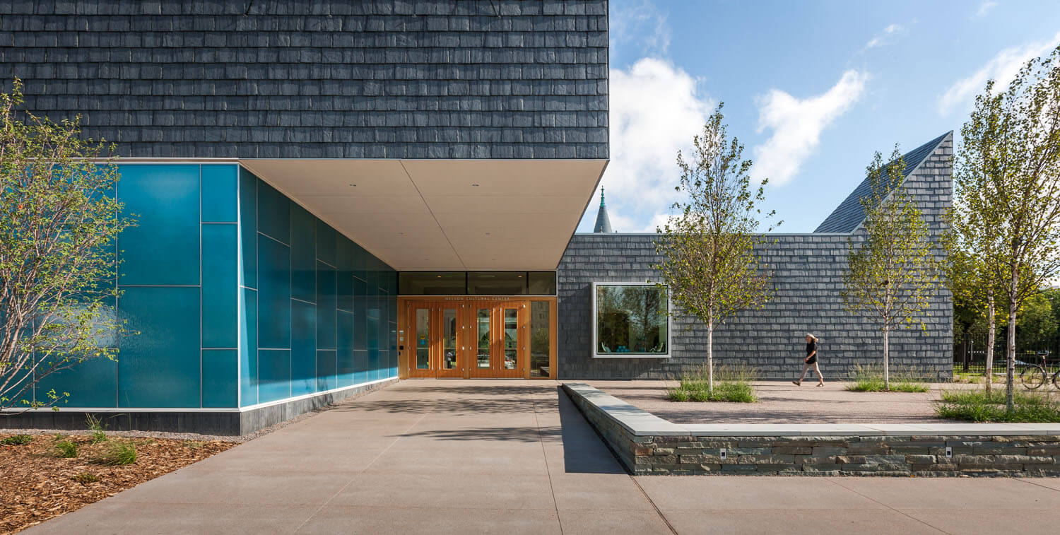The Nelson Cultural Center for the American Swedish Institute acknowledges the historic character of the adjacent Turnblad Mansion while creating a distinct architectural presence that considers contemporary and traditional Swedish aesthetics. HGA designed the Center as a complementary architectural companion, allowing the Turnblad Mansion to remain the site’s centerpiece in a symbiotic play of traditional and new architectural elements.