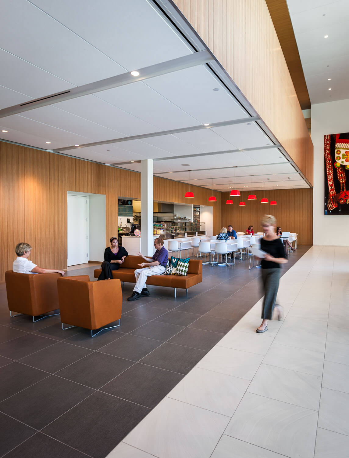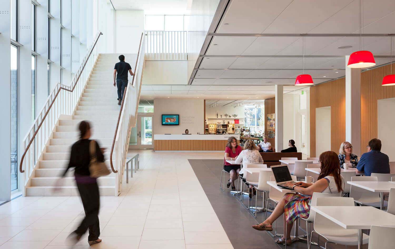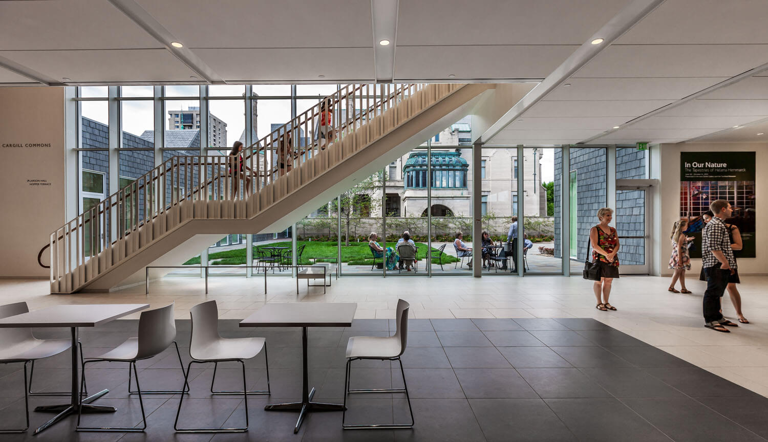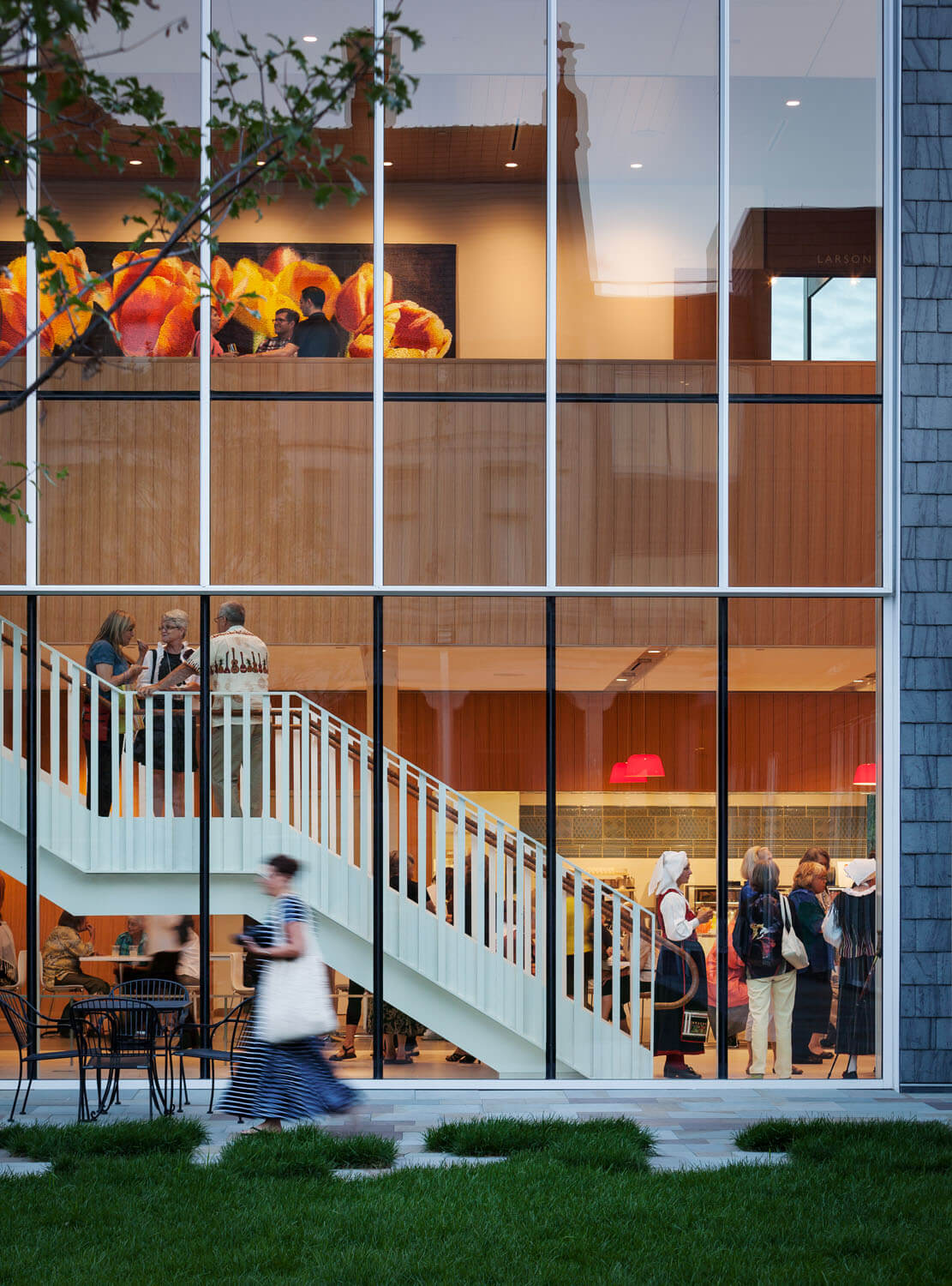 The main lobby, with new café (FIKA), is light and airy, with two-story windows visually aligning with the Turnblad Mansion and original entrance. From the lobby, the restaurant provides an entry point for visitors to start their visit, or a spot to relax and unwind after a visit through the glass corridor that connects with the main mansion and carriage house. In addition to indoor seating there is an outdoor seating area for dining between the new building and the historic mansion. The outdoor dining space is often used for events.