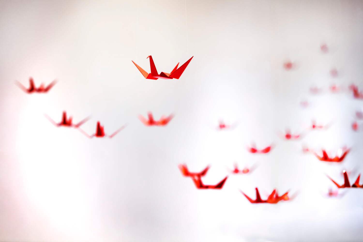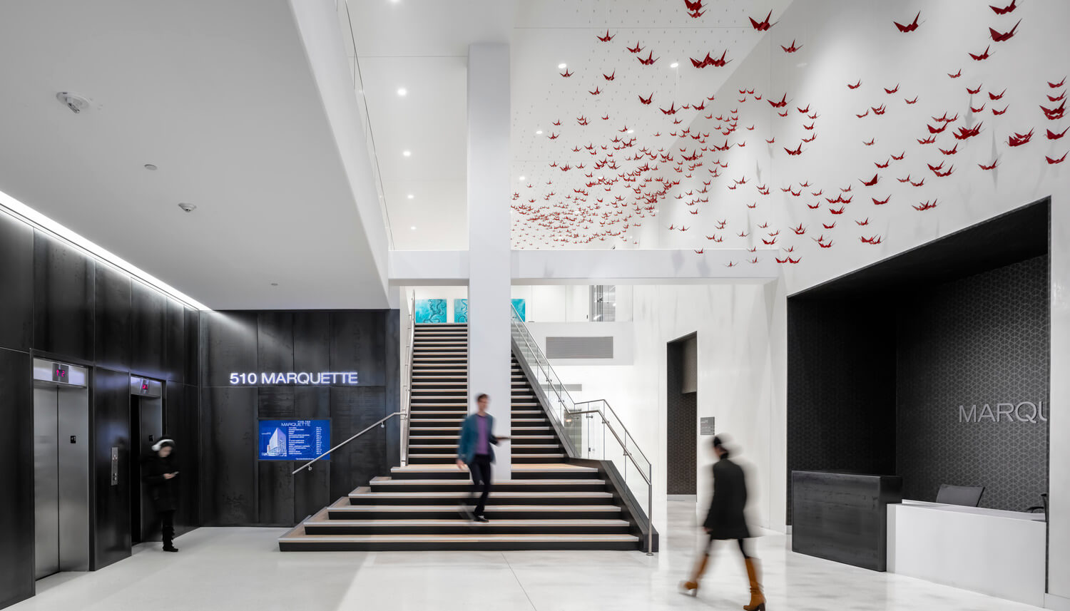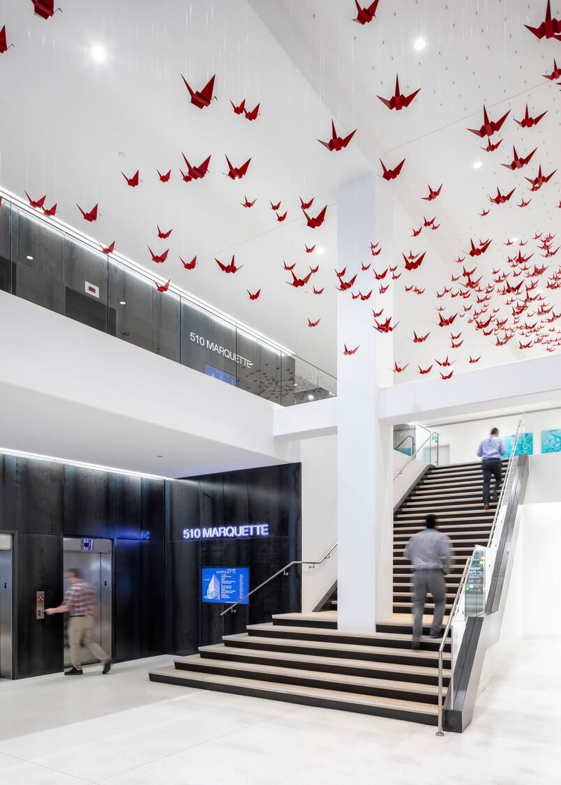 Five Ten Marquette’s existing corporate lobby possessed a simple elegance but lacked color and energy. This project solves for that shortcoming through the addition of sculptural and planar art installations. Rather than redressing the existing plaster, terrazzo and metal surfaces, the lobby’s negative space became our primary canvas. Looking at the building’s proximity to the Mississippi Flyway, a significant migratory route for waterfowl, we discovered similarities in the lobby’s own circulation patterns. Playing off of this, 555 custom fabricated figures, inspired by origami cranes, are suspended overhead to create an abstraction of migrating birds. A careful study of flocking patterns found in nature informed the composition’s swooping profile and perforated mass. The kinetic energy created by this static sculpture draws visitors through the lobby starting at its street entrance and moving upwards to its connection to the city’s 2nd Level Skyway network.