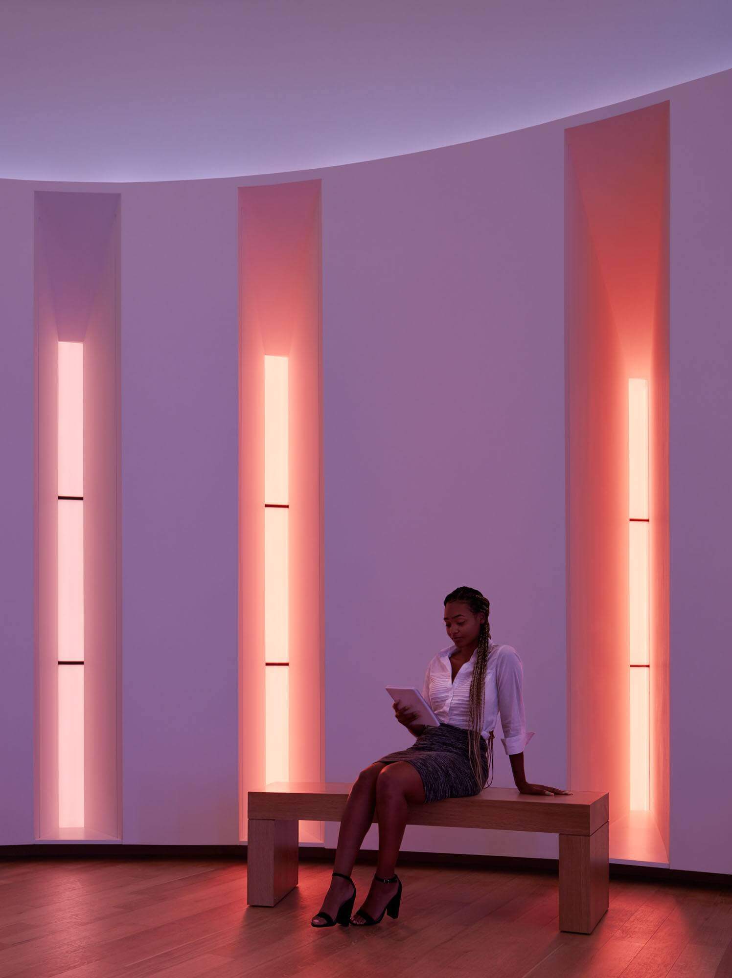 The public areas of the building represent the client’s brand as a purpose-driven financial services company. These areas welcome both clients and community neighbors with spaces including an inviting lobby, an art gallery, a credit union, a reflection room and a coffee café, all of which are connected to the downtown Minneapolis skyway system. The building design incorporates opportunities to showcase both the client’s culturally significant art collection and their unique brand and purpose.
