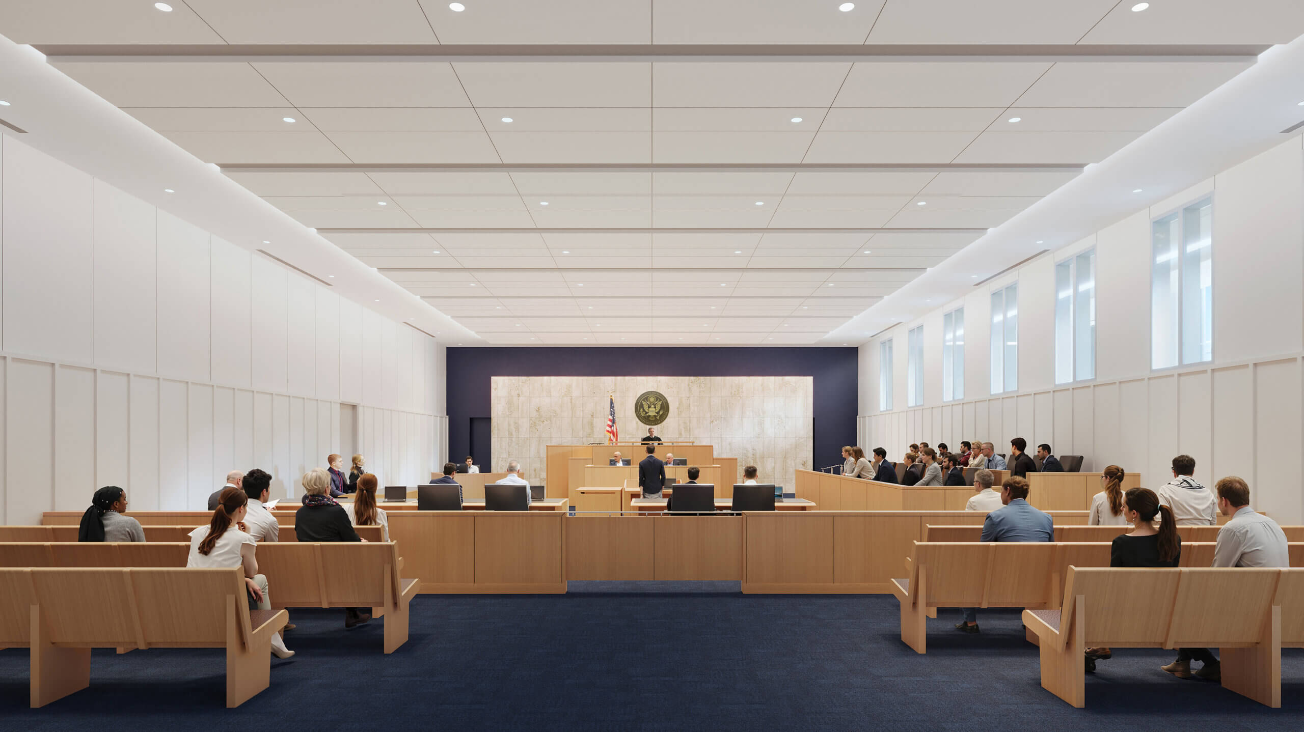 It is designed to accommodate all court functions, including 12 courtrooms and 17 chambers, to house U.S. Court of Appeals, U.S. District Court, and U.S. Bankruptcy Court judges. The courthouse will also house the U.S. District Clerk, U.S. Bankruptcy Clerk, and U.S. Marshals Service. Each courtroom floor will include two courtrooms planned around a central core that holds elevators, stairs, restrooms, and conference rooms for each courtroom. Judges chambers include private offices, restrooms, conference rooms, and office spaces for clerks and staff. Daylighting from the corridors on each floor penetrate into the courtrooms through clerestory windows.