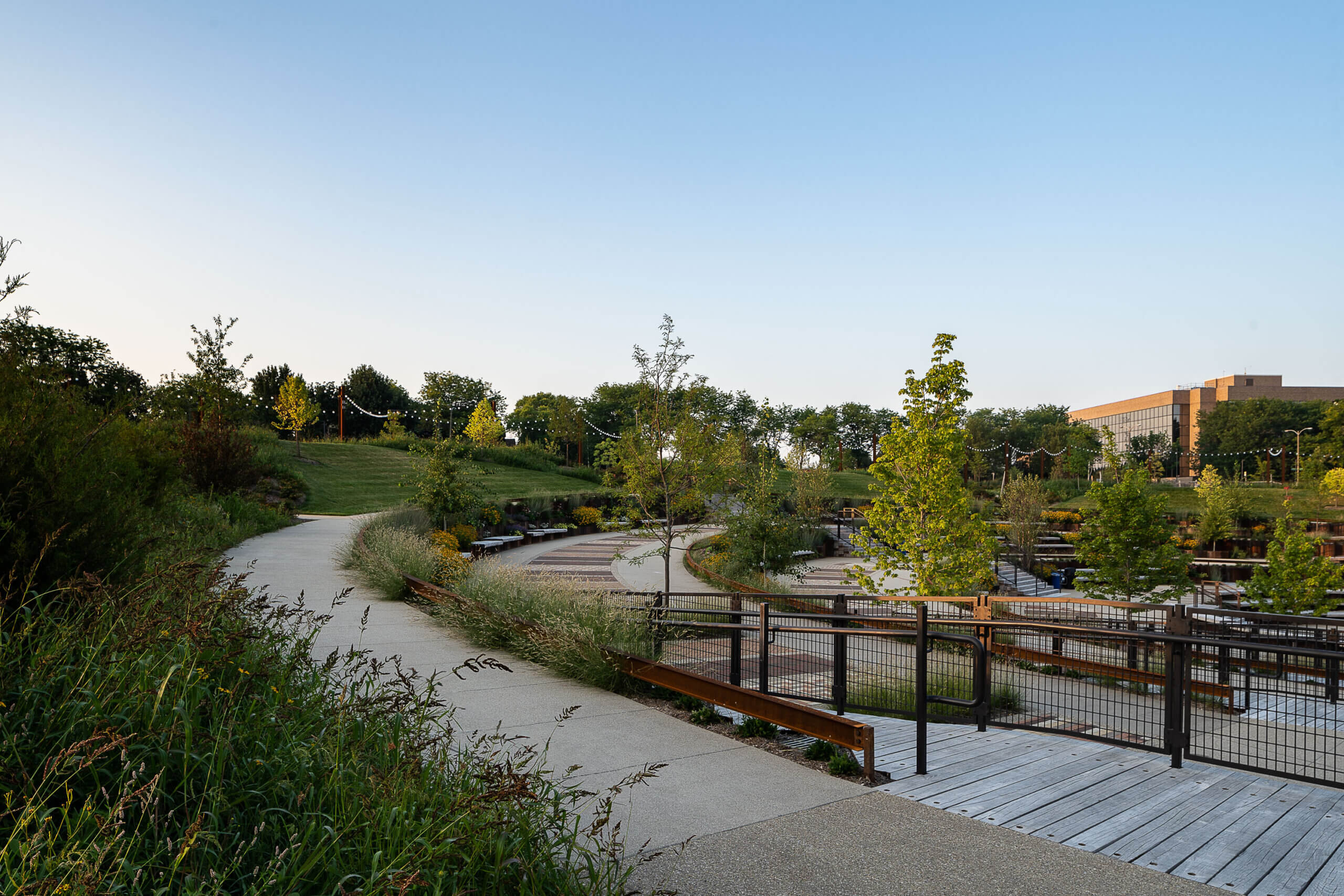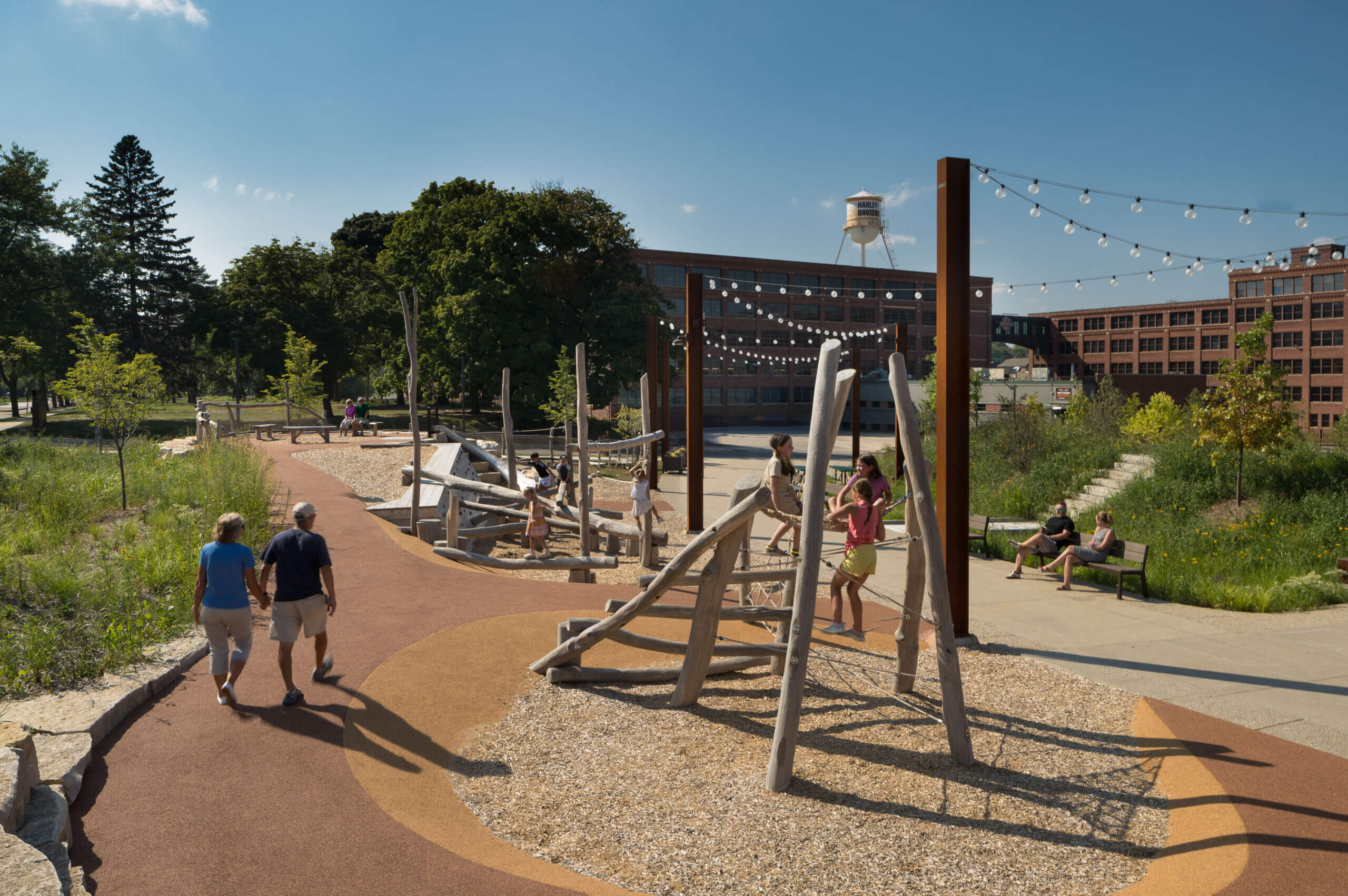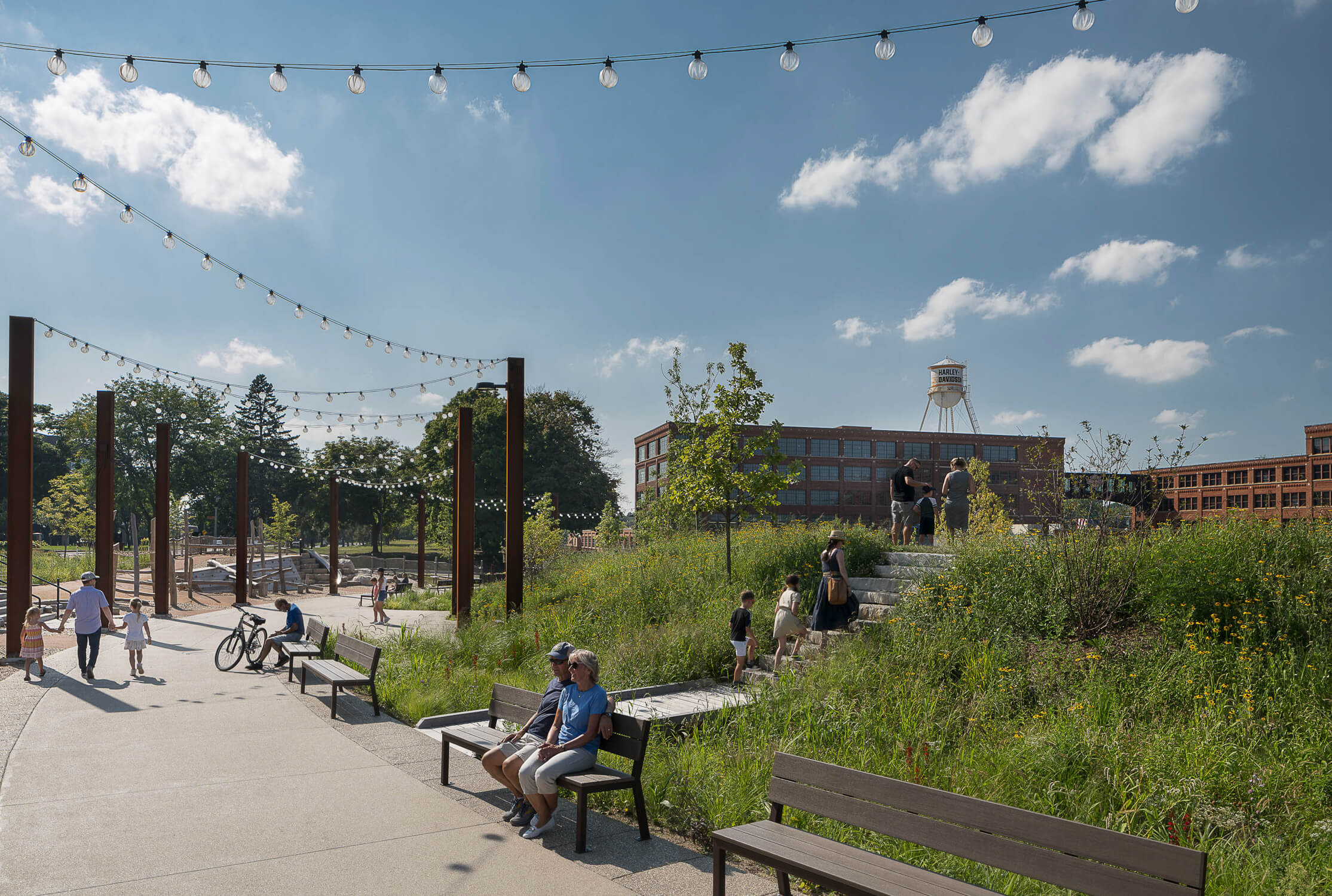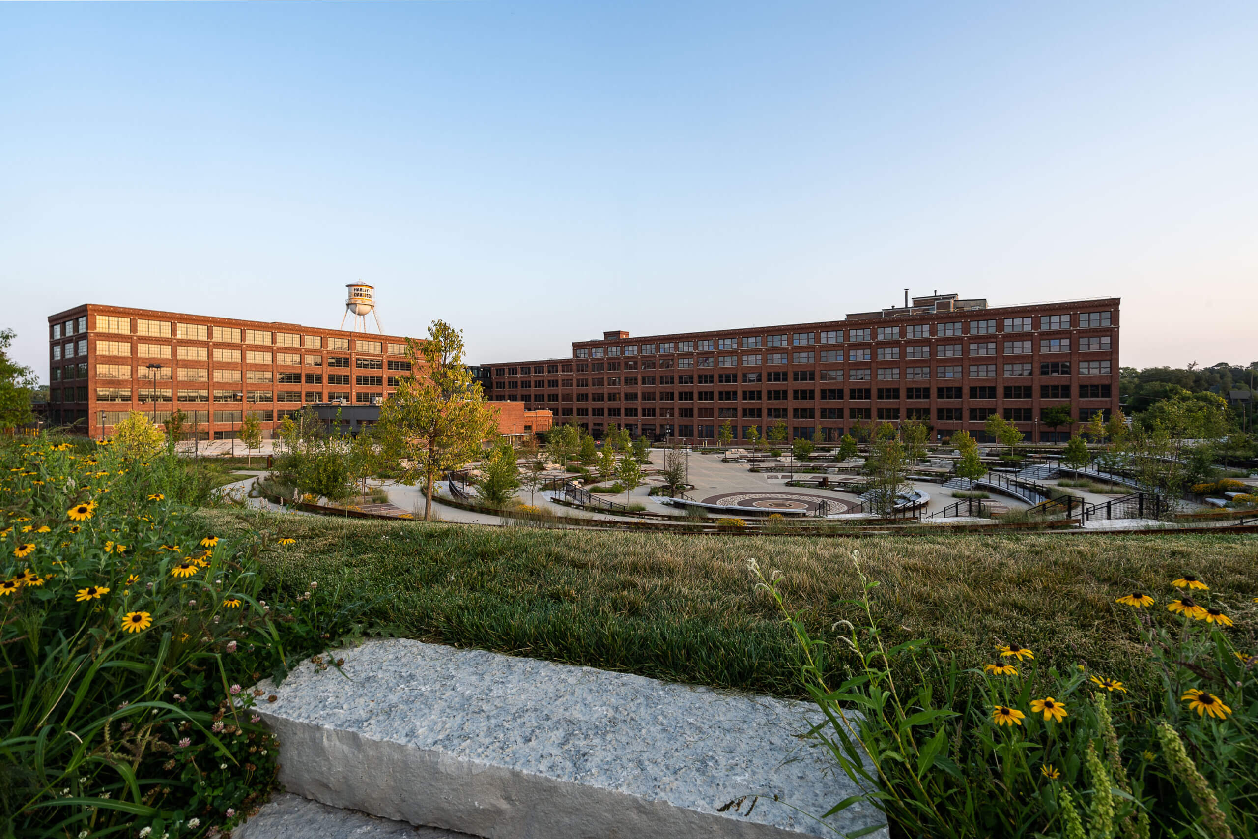 In one direction, “The Hub” provides views of the brick buildings of the original home of Harley-Davidson. In the other, visitors see a park sown with 120 native plant species, including 20 species of trees and 100 species of perennials, some of which are sacred to the Forest County Potawatomi tribe, who have helped provide guidance throughout the process.