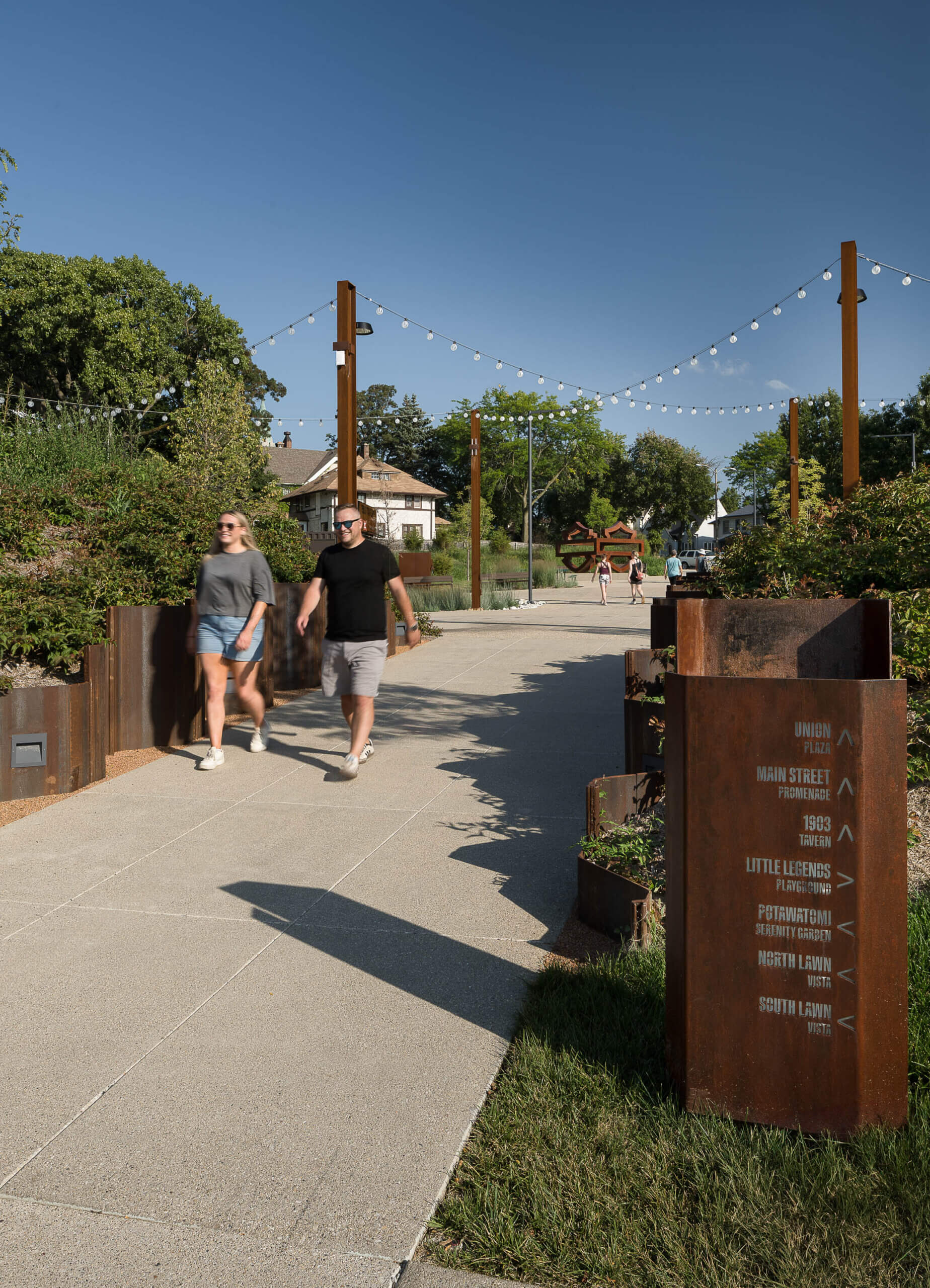 The main pedestrian entrance to the park is Union Plaza, located off West Highland Boulevard. At approximately 11,000 square feet, the plaza leads to Main Street and the Hub and will be a destination in itself, with flexible space for temporary markets, food trucks, and events. Union Plaza will be made from concrete with varying textures. It is home to a 10-foot tall, weathered steel sculpture inspired by Harley Davidson’s iconic bar and shield.