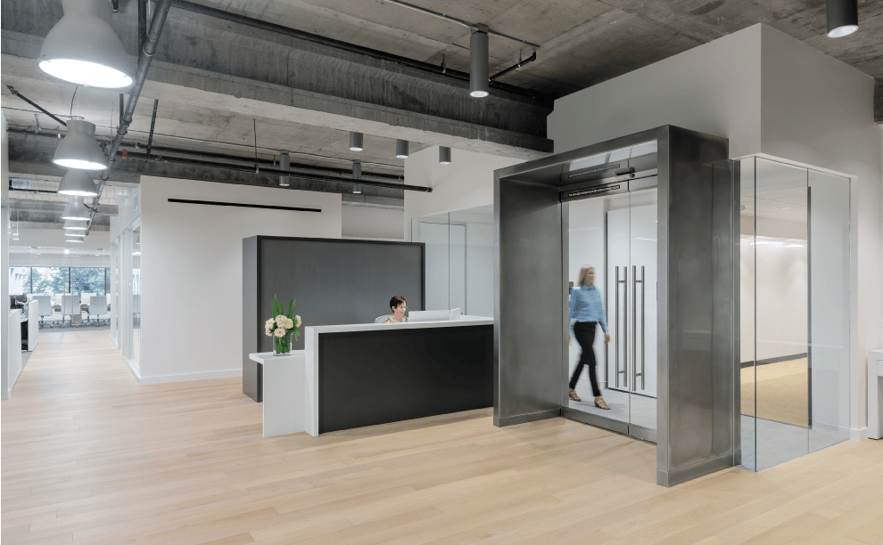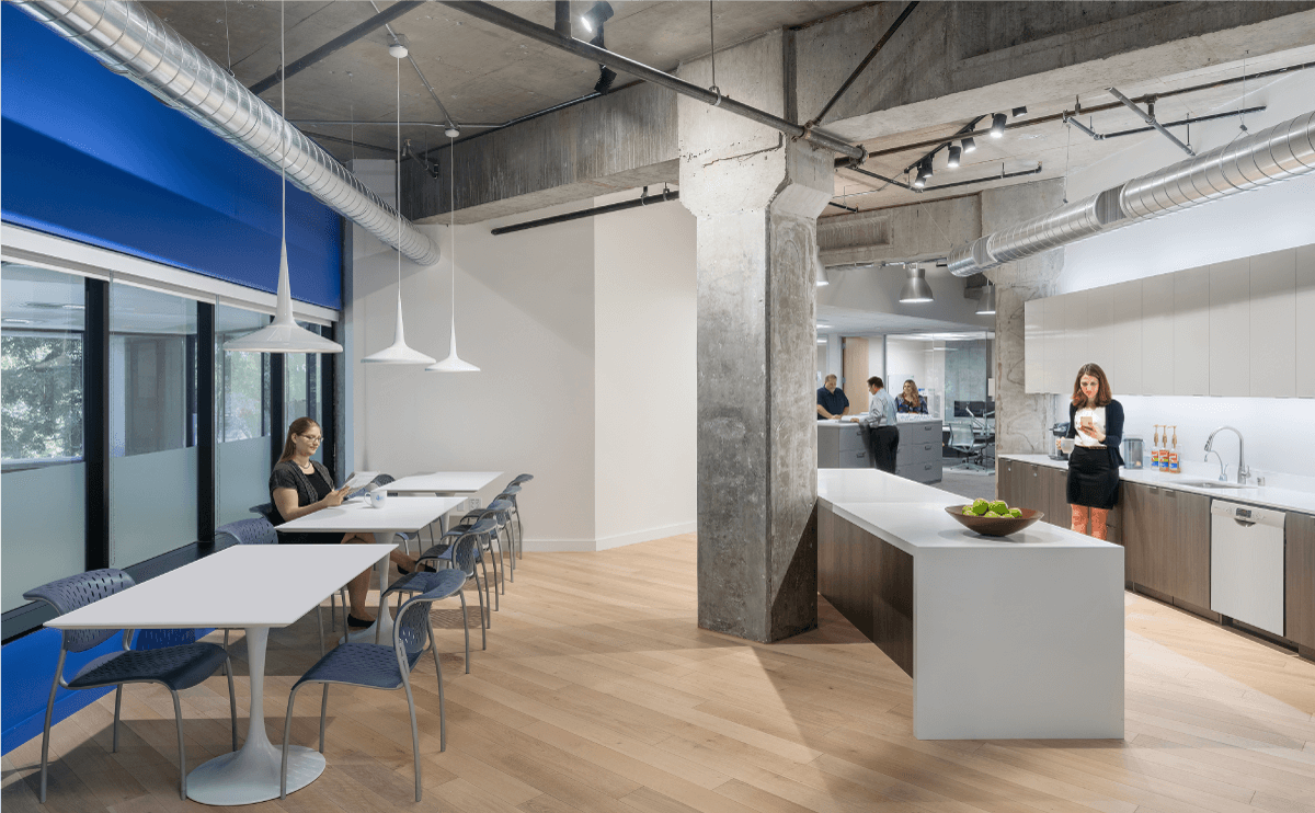 Working with Hudson Pacific Properties, HGA directed tenant improvements for the company’s 2nd-floor, 12,000 SF workspace for their San Jose Airport portfolio, which include a variety of workspaces, three conference rooms, IT Closet, and support spaces. Following the company’s existing design criteria—including the Hudson blue backwall—HGA retained a clean aesthetic with wood floors, exposed concrete ceilings, neutral white-and-metallic tones that contrast with the signature blue backwall, open workstations, glass-front private offices, and expansive glass walls that visually open the conference rooms to rest of the office.