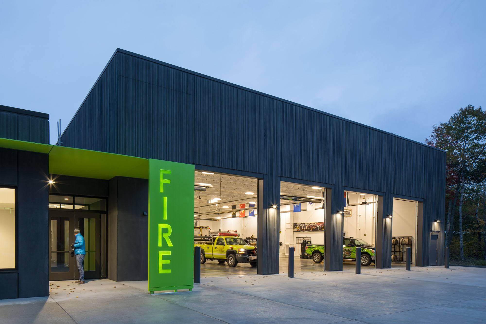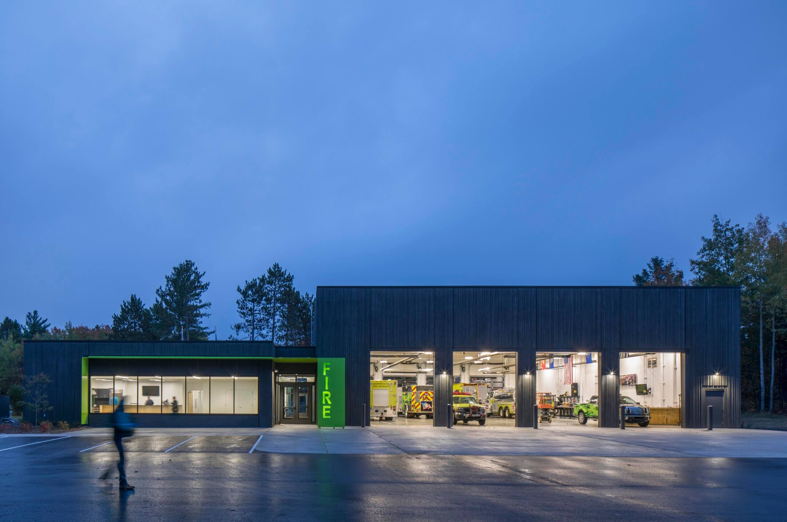 The exterior of the building is clad in custom precast panels that create random vertical shadows reminiscent of the shade and silhouettes found in a Northwoods forest – juxtaposed by a striking acid green, steel canopy. A fire engine, ATV’s, boats, and ambulance are housed in the buildings four drivethrough apparatus bays. The 10,300 square foot station also includes offices, a training area, kitchen, fitness center, bathrooms, and showers.